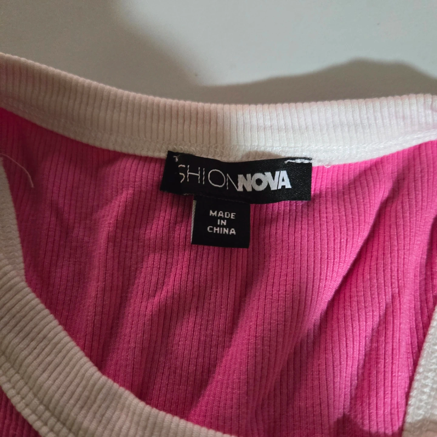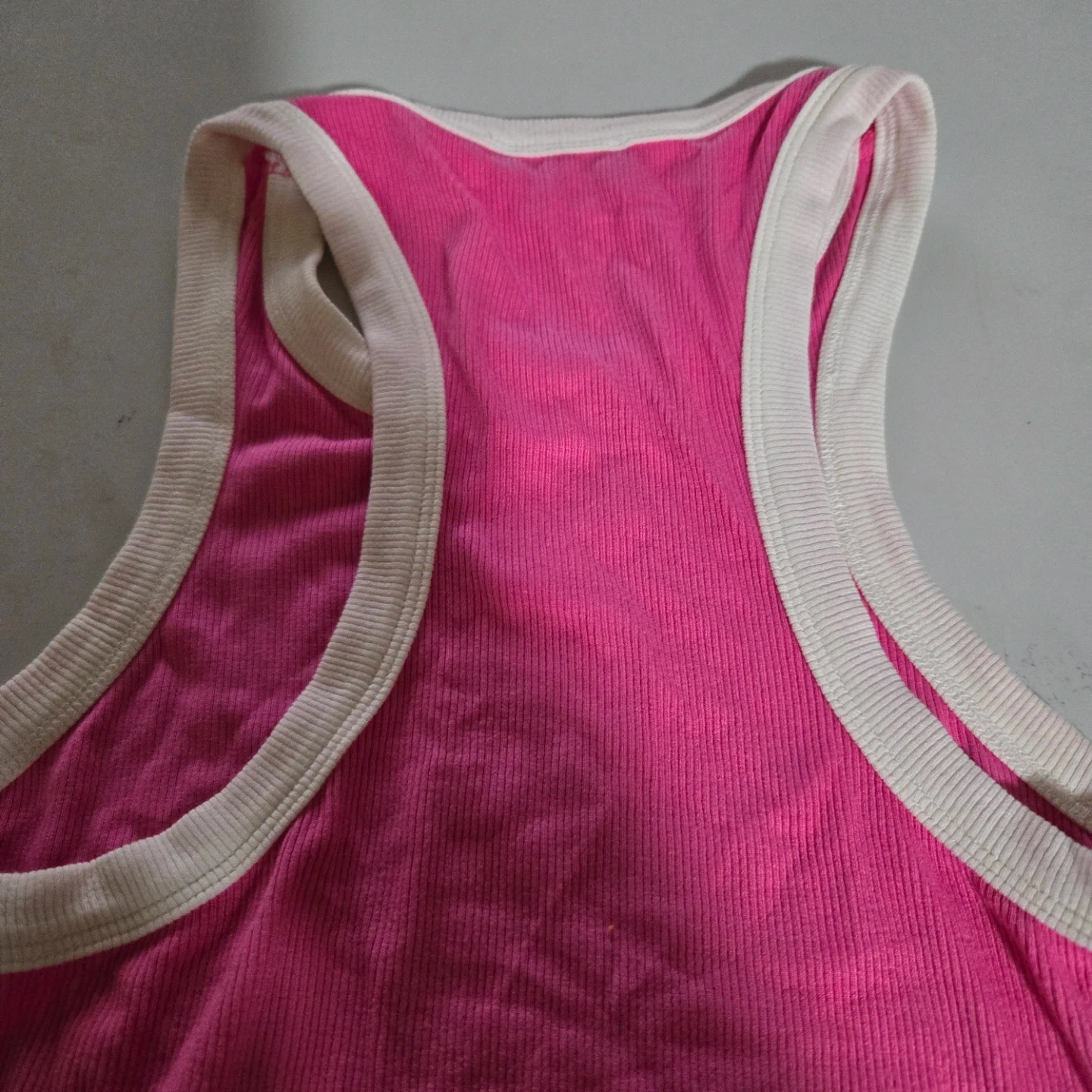 This Fashion Nova tank top is bright pink with white trim. It has "dump him" embroidered on the front. Made in China.