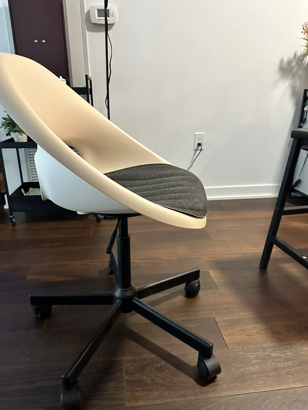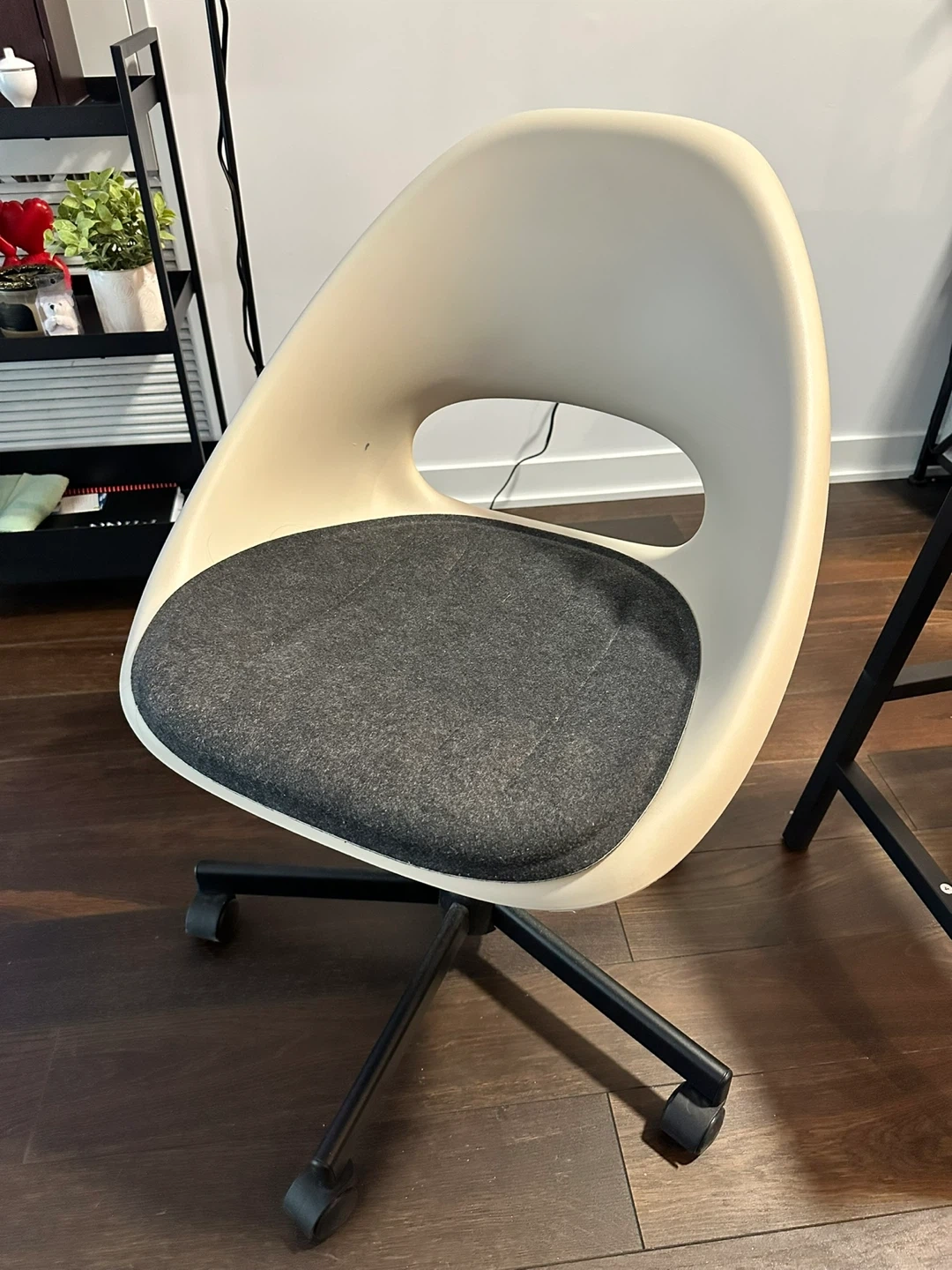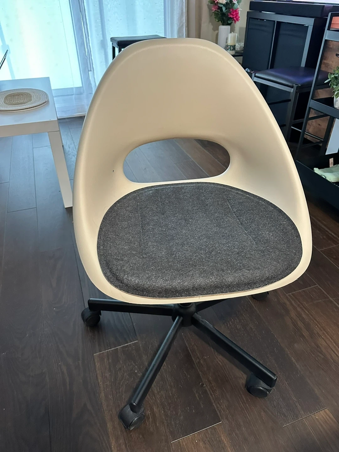 This is a stylish office chair with a beige shell and a grey upholstered seat cushion. It's got a modern, scooped design and sits on a black five-star base with wheels. The seat height is adjustable for comfort. It's a great accent piece for a home office!