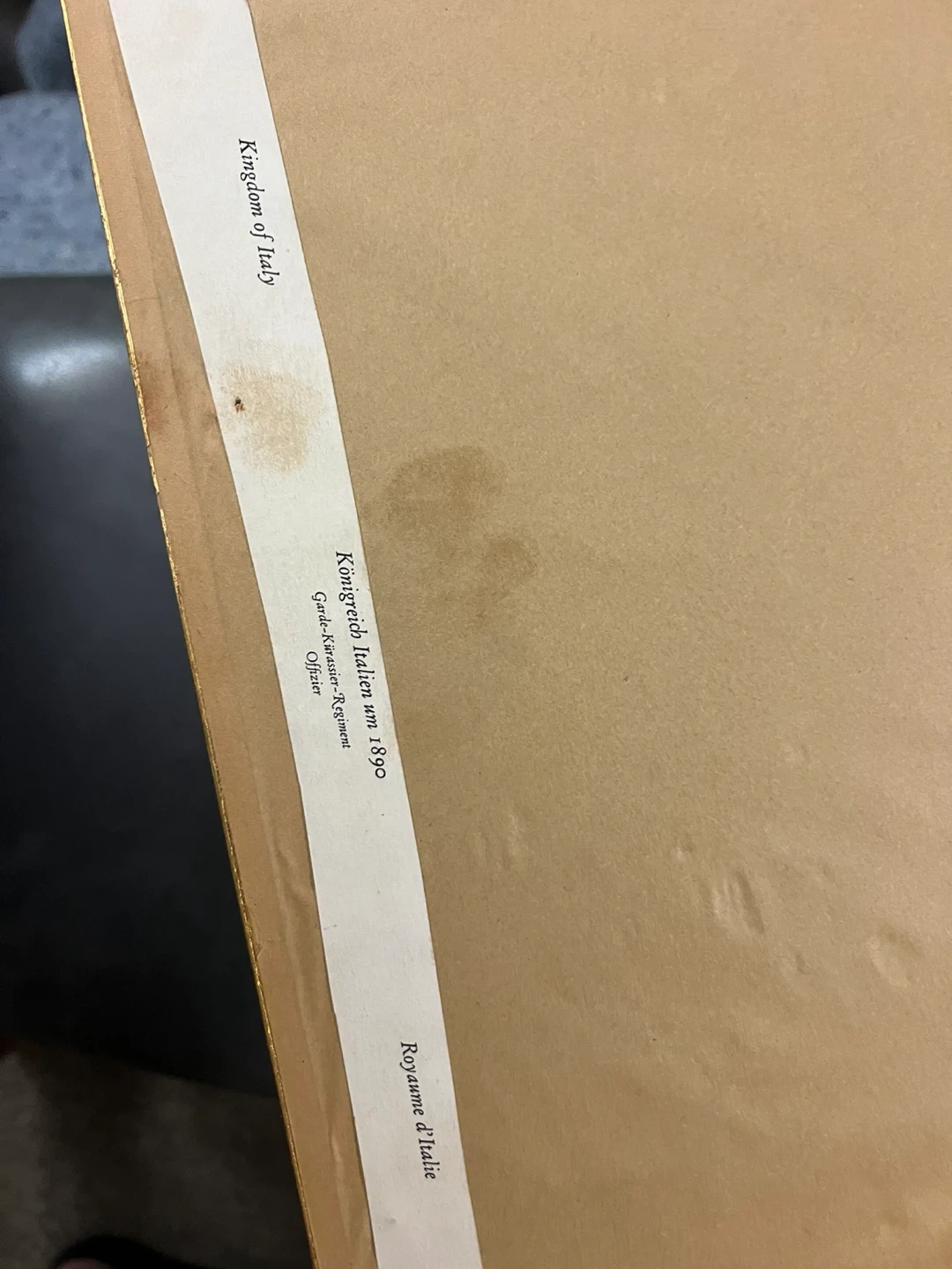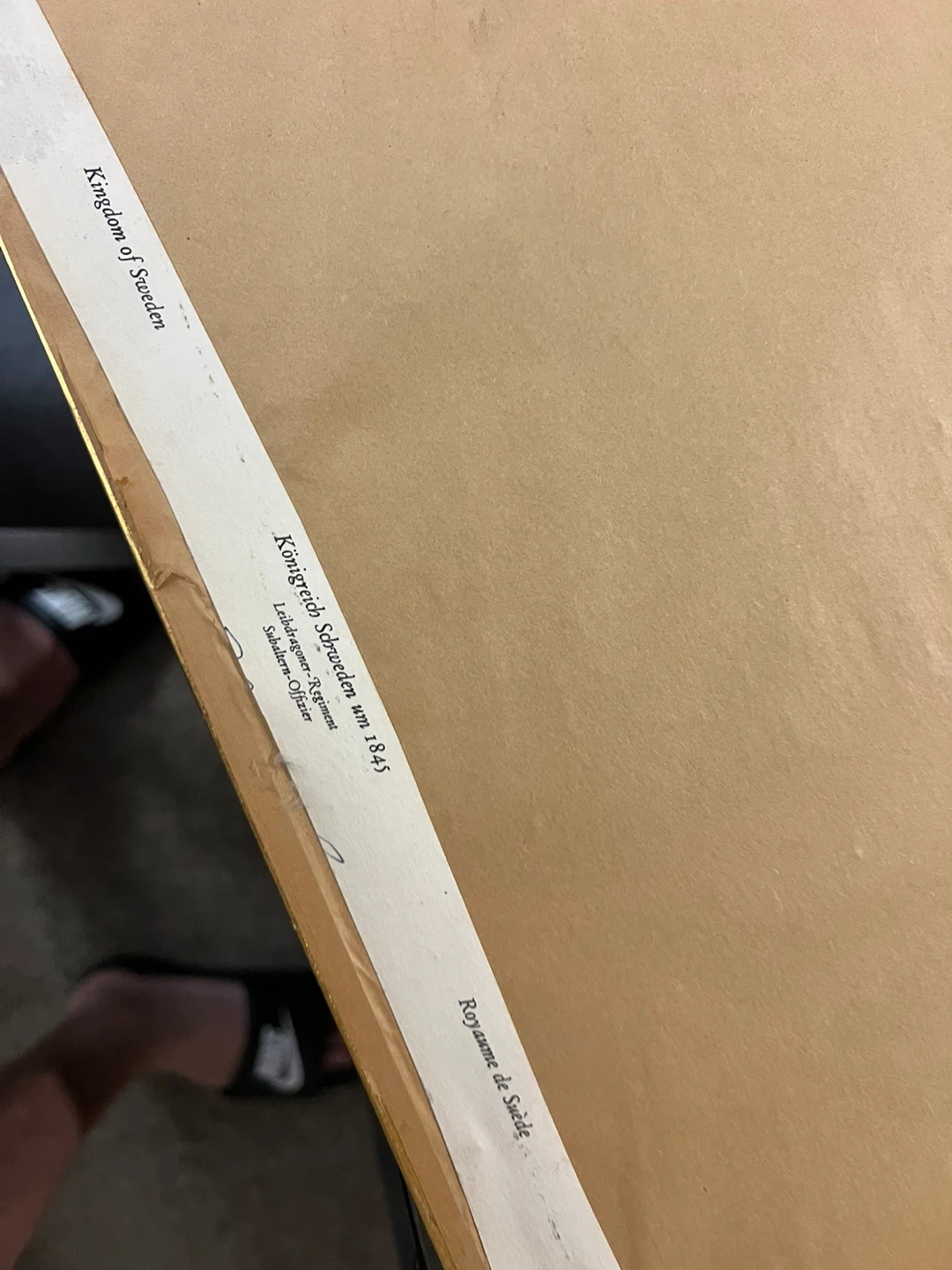 These are two framed prints depicting historical soldiers on horseback. One print shows a soldier from the Kingdom of Italy in 1850, and the other shows a soldier from the Kingdom of Sweden in 1845. They're framed in gold-coloured frames with dark matting.