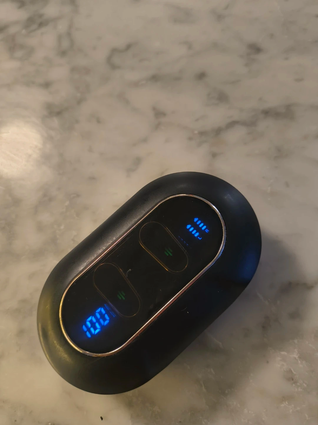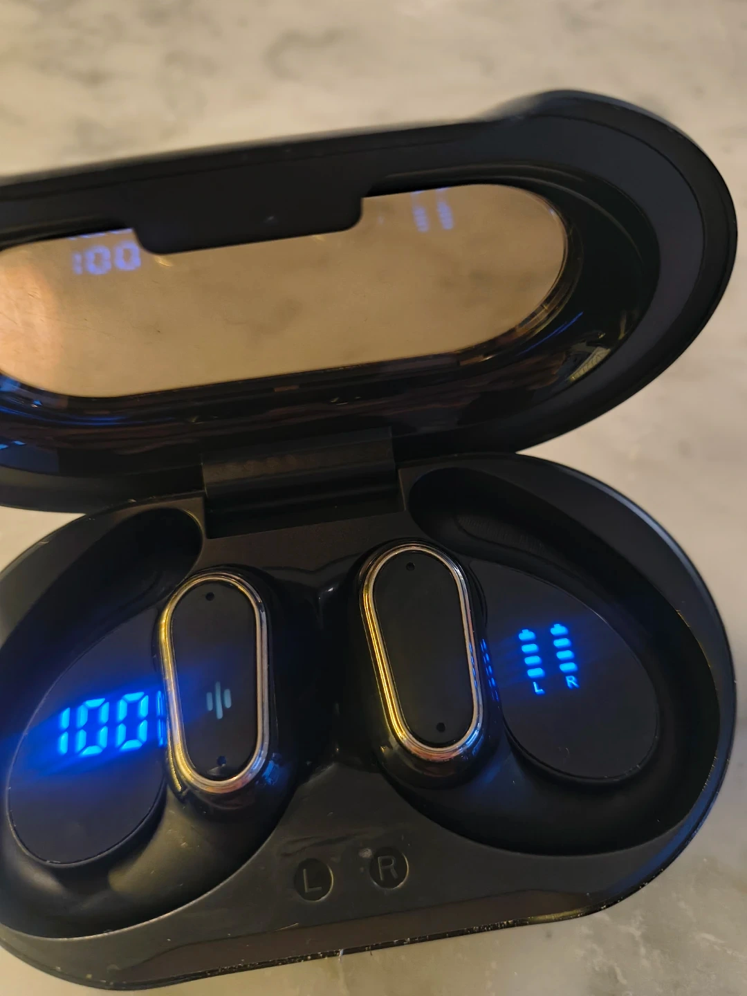 Selling a pair of wireless earbuds. They come with a charging case. The charging case and earbuds have a blue LED display to show the battery level. They are in great condition and ready for a new owner