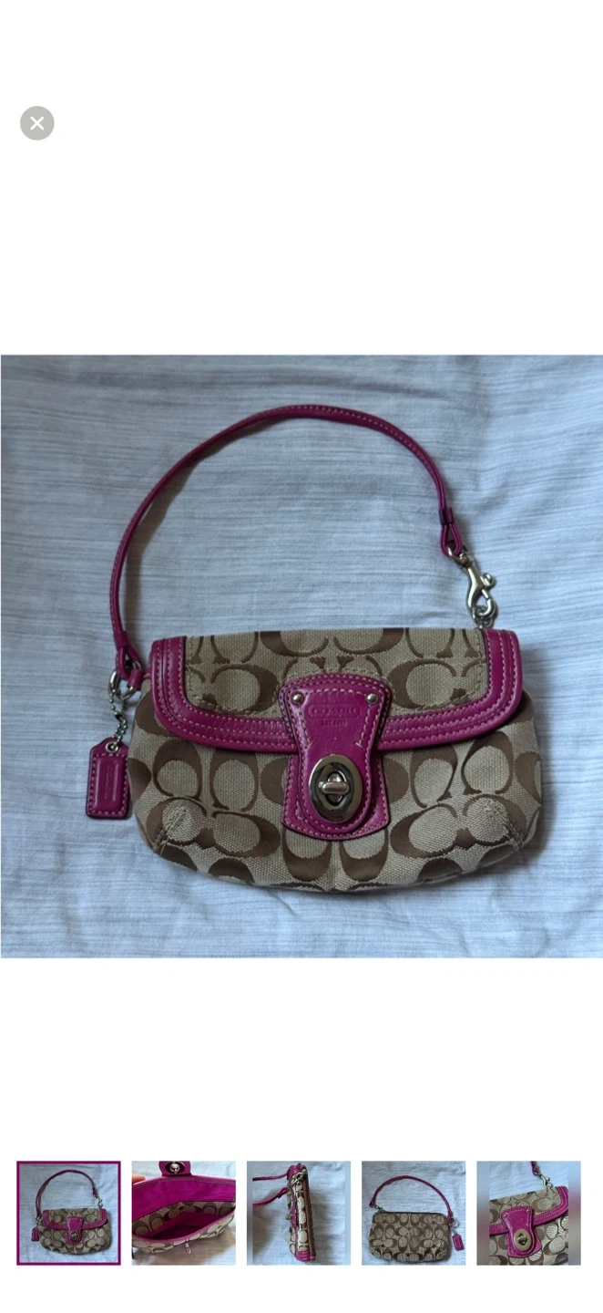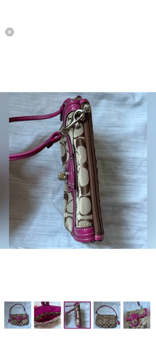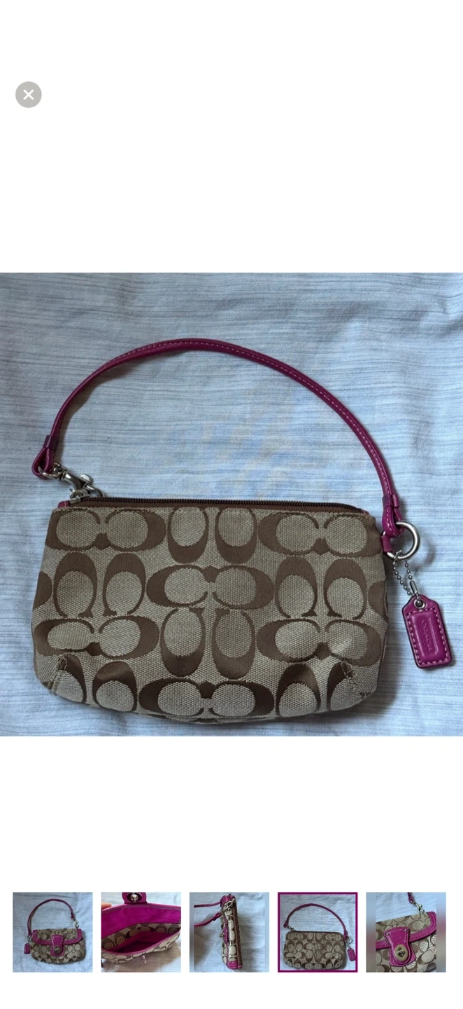Elegant Coach wristlet with fuchsia leather accents and iconic tan pattern. Ideal for chic outings. 18.5cm x 12cm