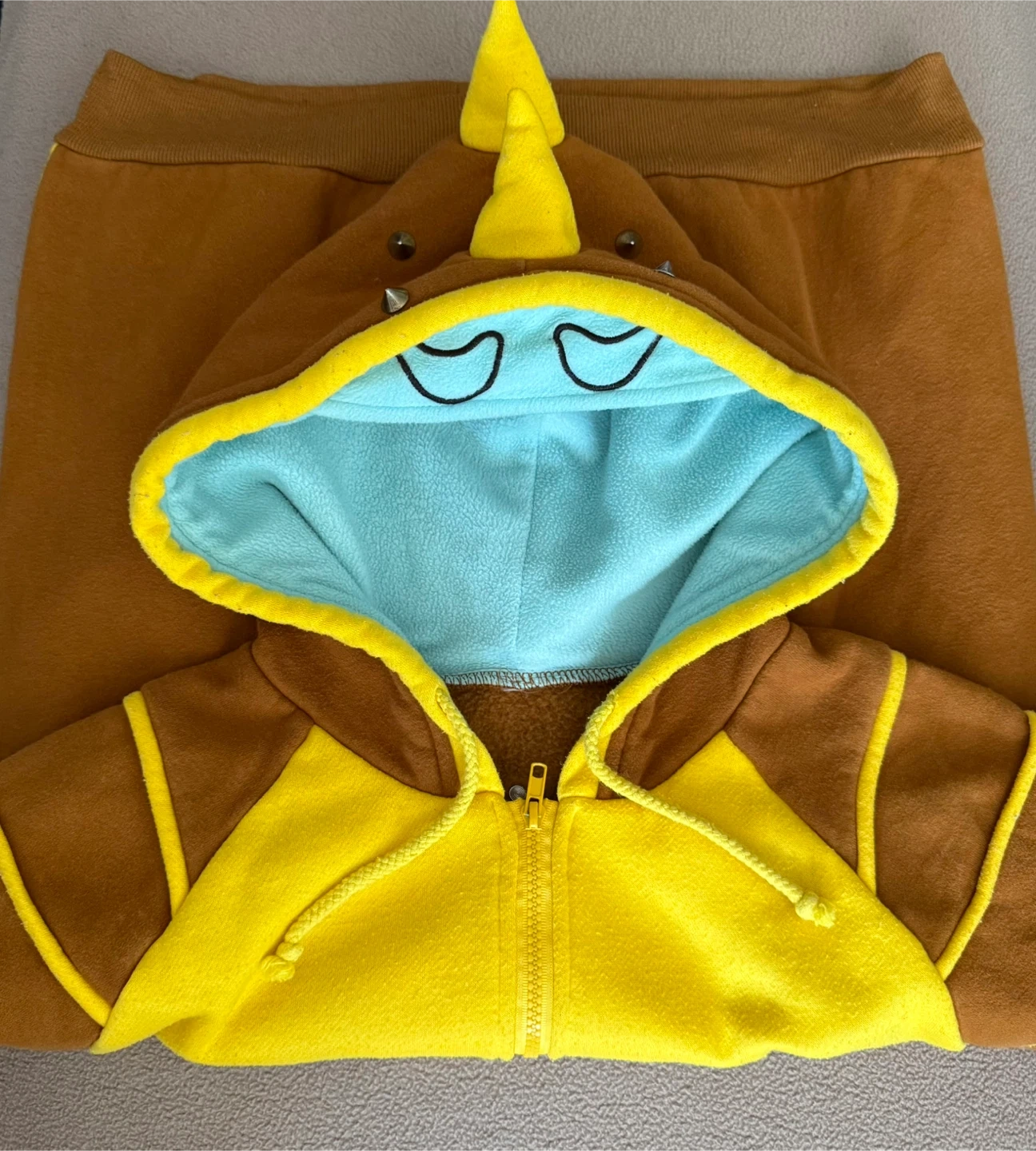 Here's a fun dinosaur hoodie in brown and yellow! It has a unique design with spikes on the hood and accents on the sleeves. Perfect for adding a playful touch to any outfit