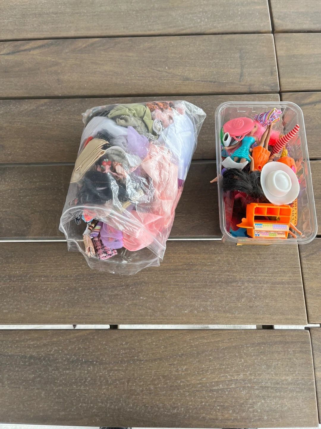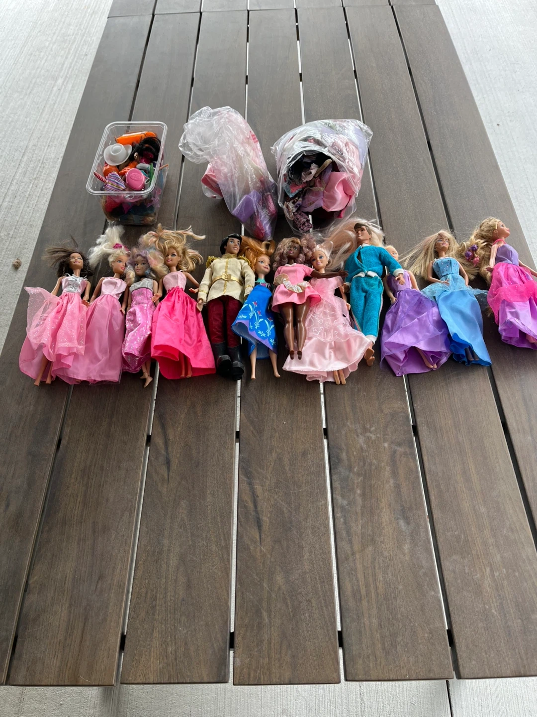 This lot includes a variety of dolls and a bag full of doll clothing and accessories. It's perfect for imaginative play and dress-up fun. There's also a clear container filled with smaller doll items.