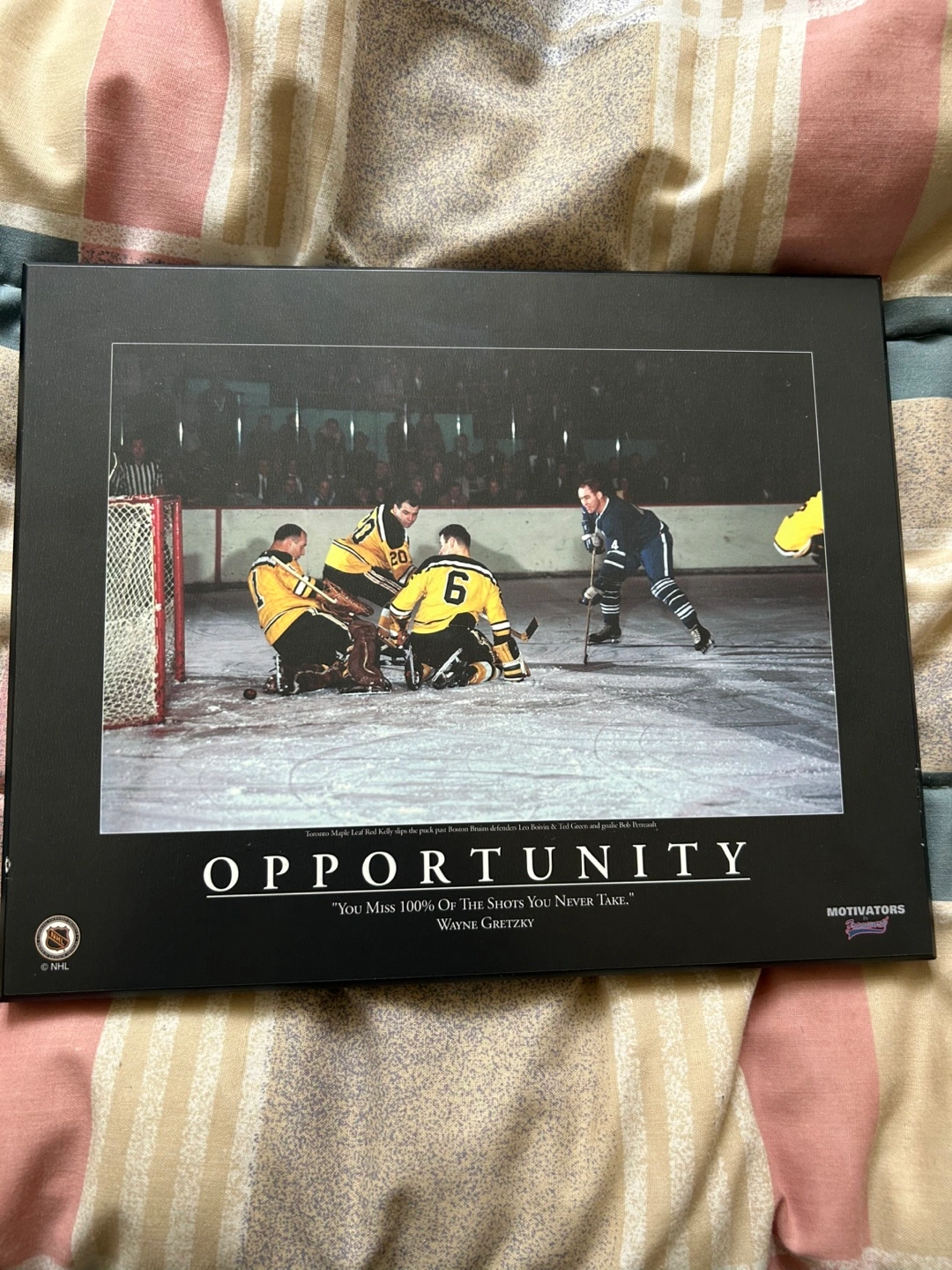 Selling a framed print featuring Wayne Gretzky with the quote, 'You miss 100% of the shots you never take' It's a motivational piece with an image of a hockey game in action