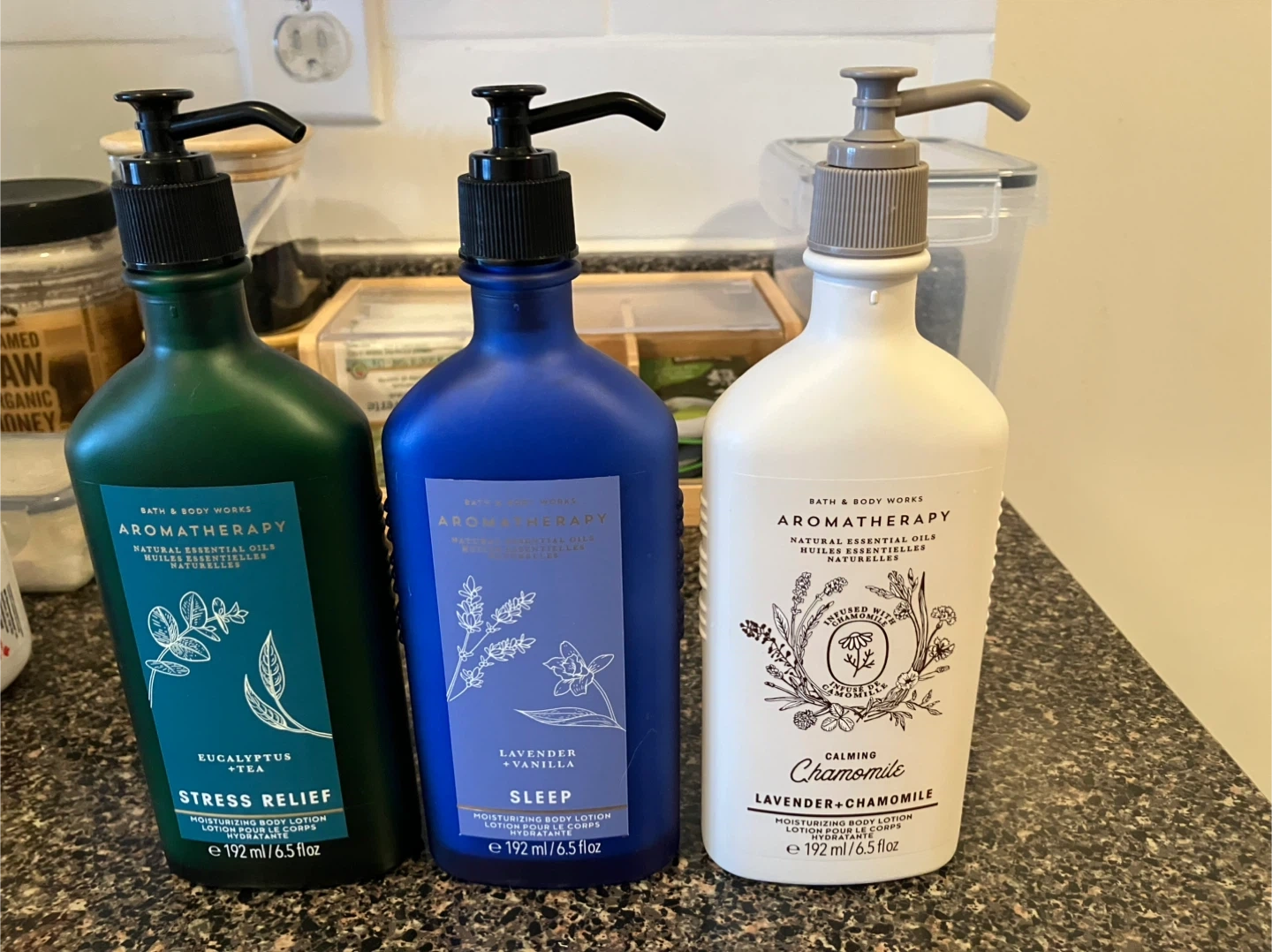 Selling three bottles of Bath & Body Works Aromatherapy moisturizing body lotion. Includes Eucalyptus + Tea (Stress Relief), Lavender + Vanilla (Sleep), and Calming Chamomile. Each bottle contains 192 ml / 6.5 fl oz $10 for all 3. Not opened. Plus a half full rose scented lotion (same line, not in photos)