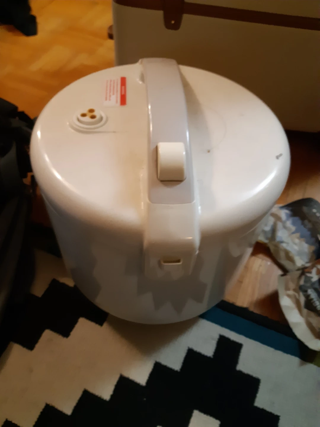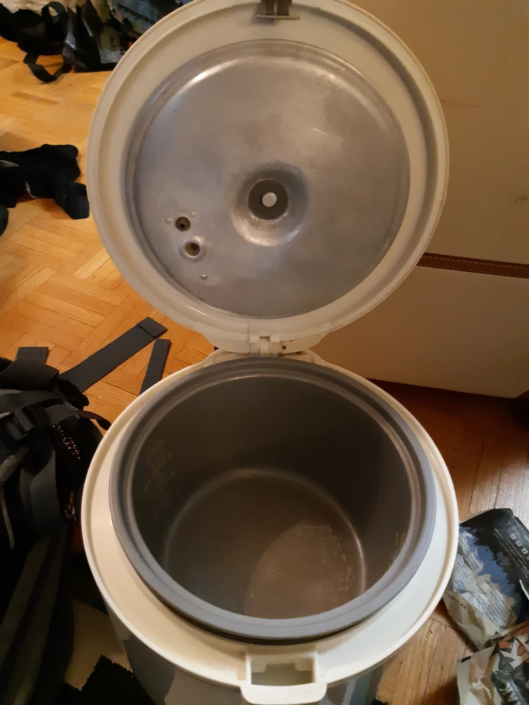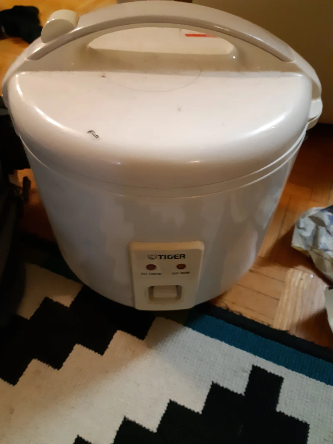 This is a Tiger brand rice cooker. It's white and has a capacity for cooking rice. The inner pot is made of metal.