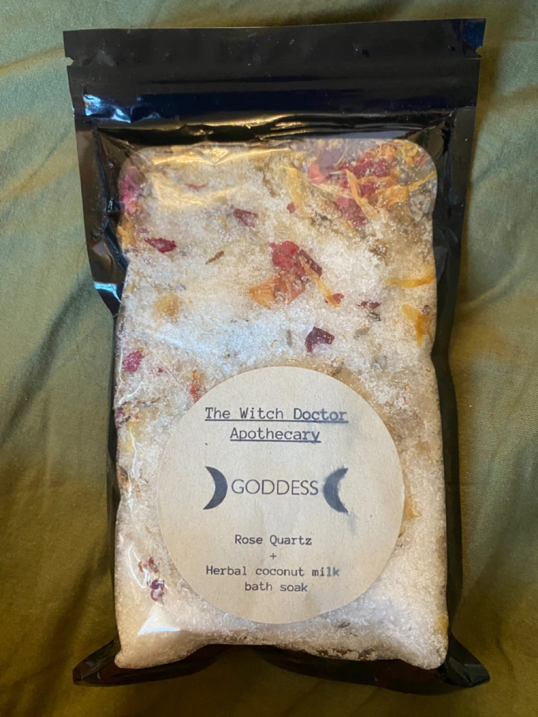 Brand new, never used bag of The Witch Doctor Apothecary Goddess Bath Soak which contains rose quartz and herbal coconut milk.