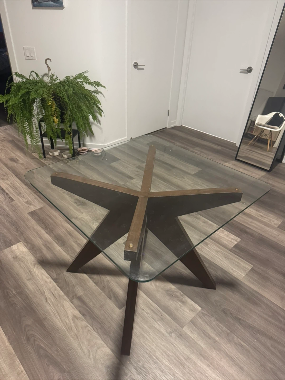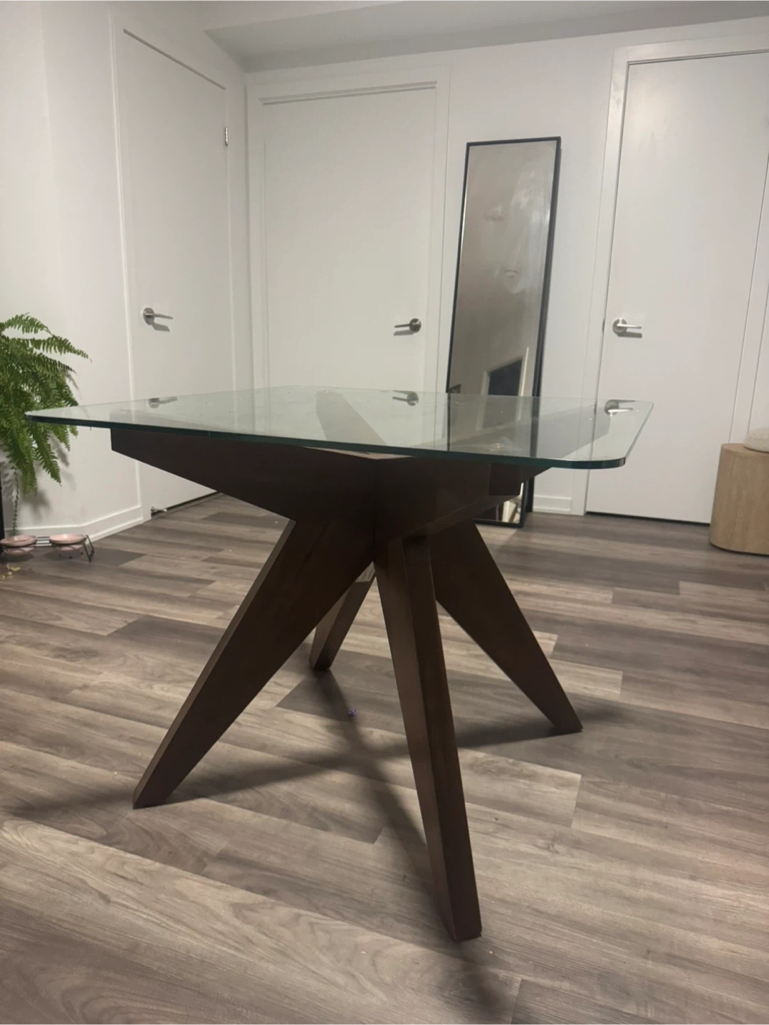 Stylish dining table with a clear glass top and a unique wooden starburst base. Its modern design fits well in any living space. This table's compact size makes it a great accent piece.