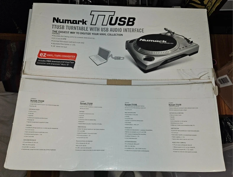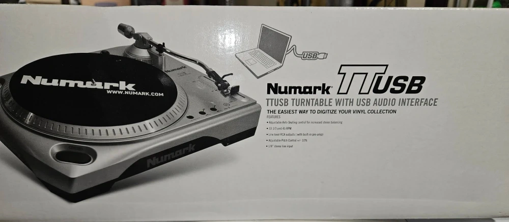 Selling a Numark TTUSB turntable! It's the easiest way to digitize your vinyl collection. Features include: - Adjustable anti-skating control for increased stereo balancing - 33 1/3 and 45 RPM - Line level RCA outputs (with built-in pre-amp) - Adjustable pitch control +/- 10% - 1/8" stereo line input Box included