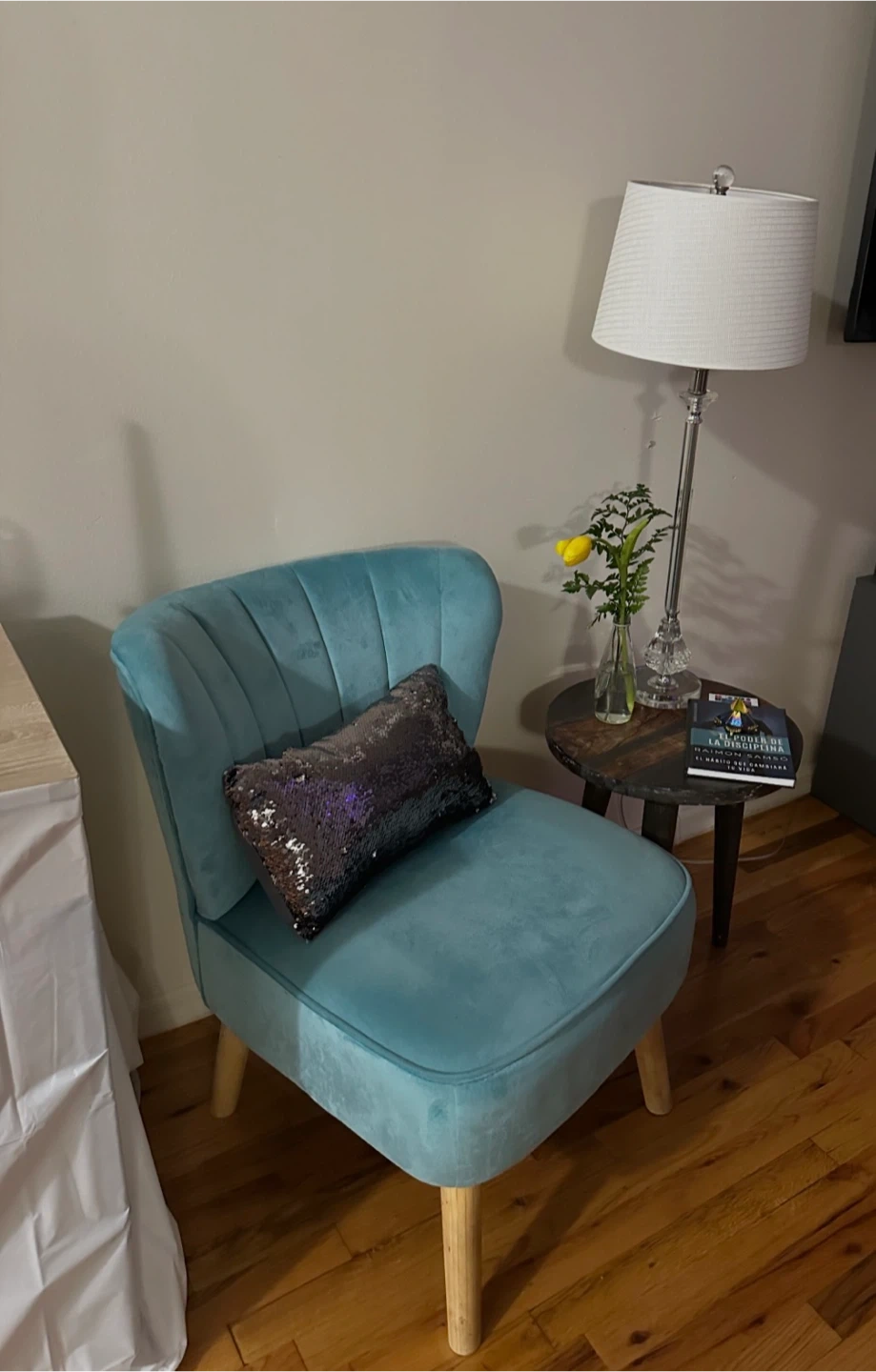 This chair's teal velvet upholstery and elegant design add a pop of color to any room. It's built with a sturdy frame and wooden legs for durability. The channeled back provides comfortable support.