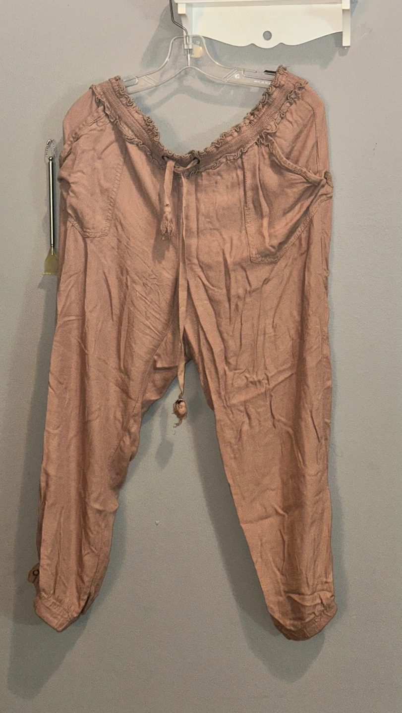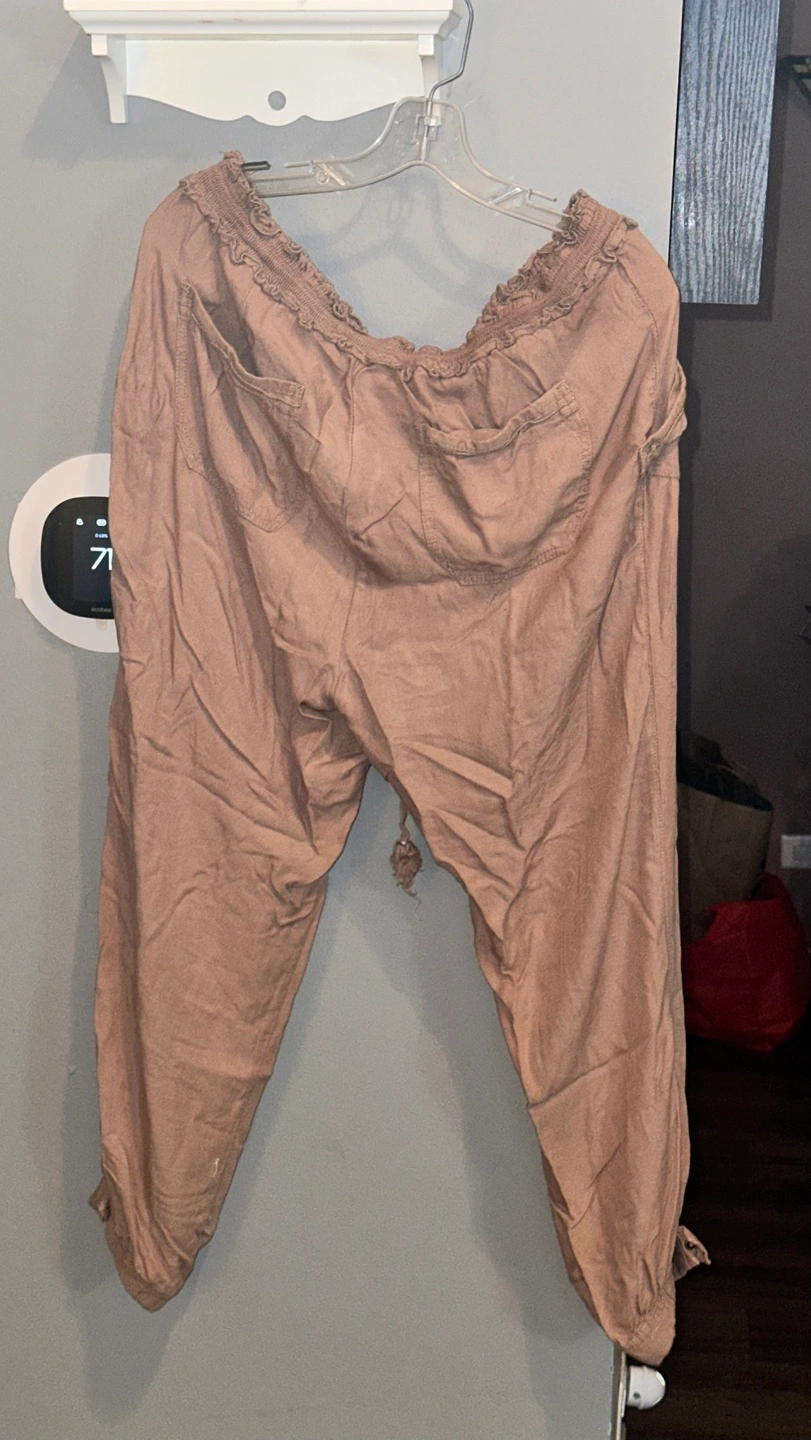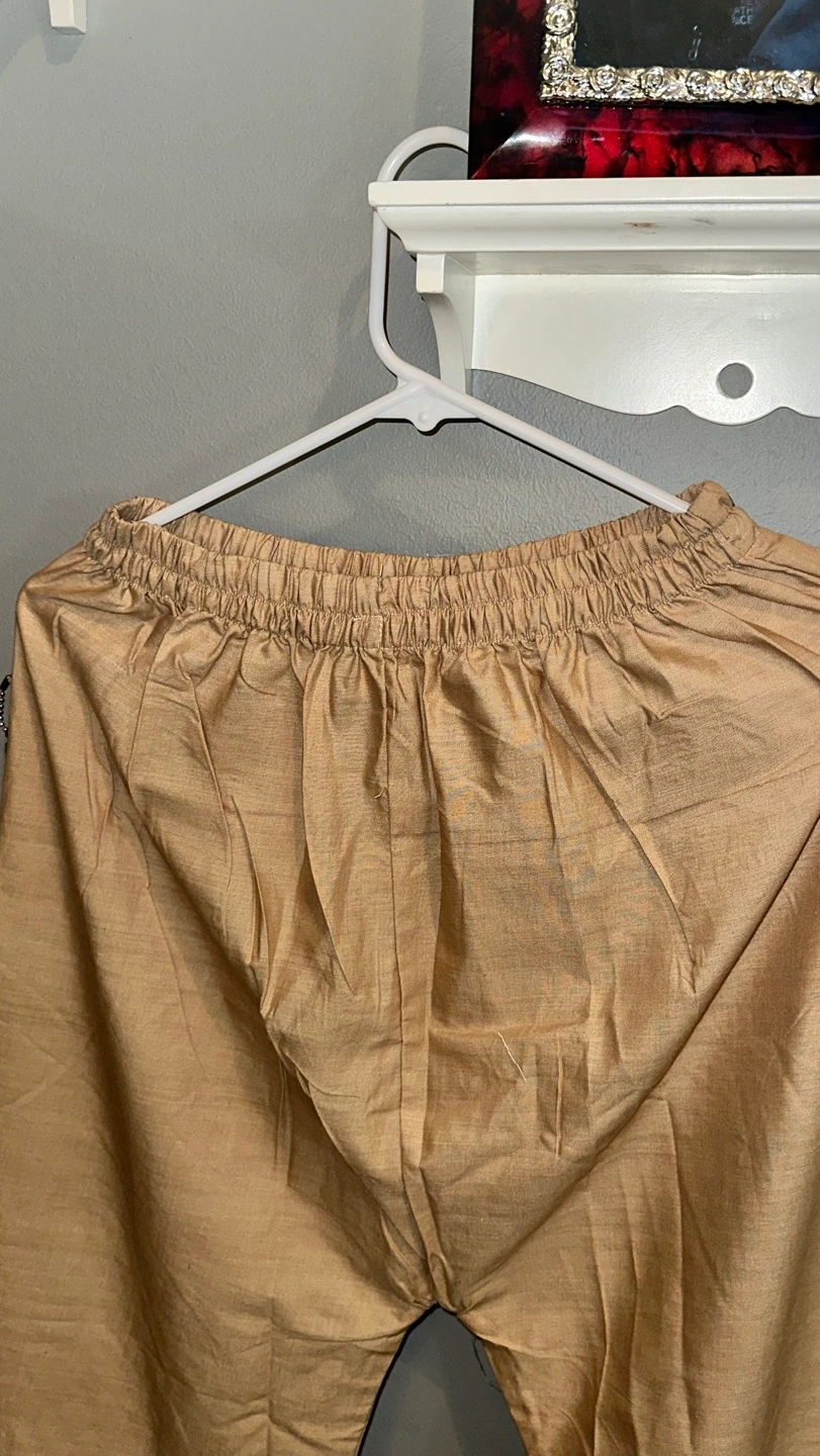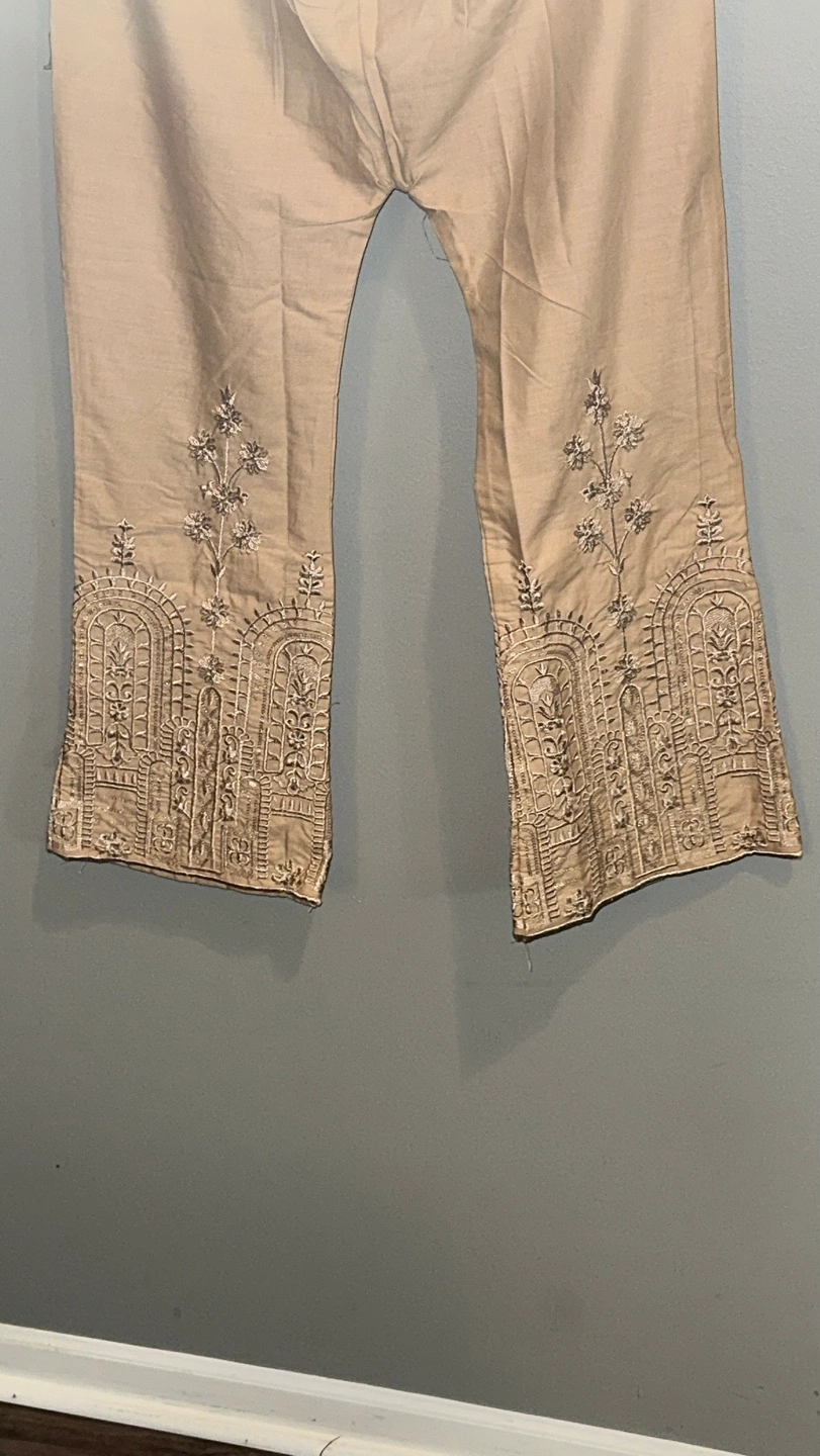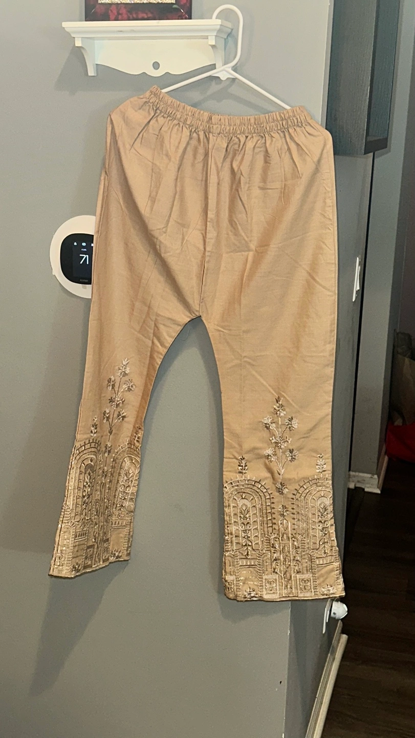 Women's beige palazzo pants. Elastic waistband. Embroidered details at the bottom. Flared legs. Great for casual wear.