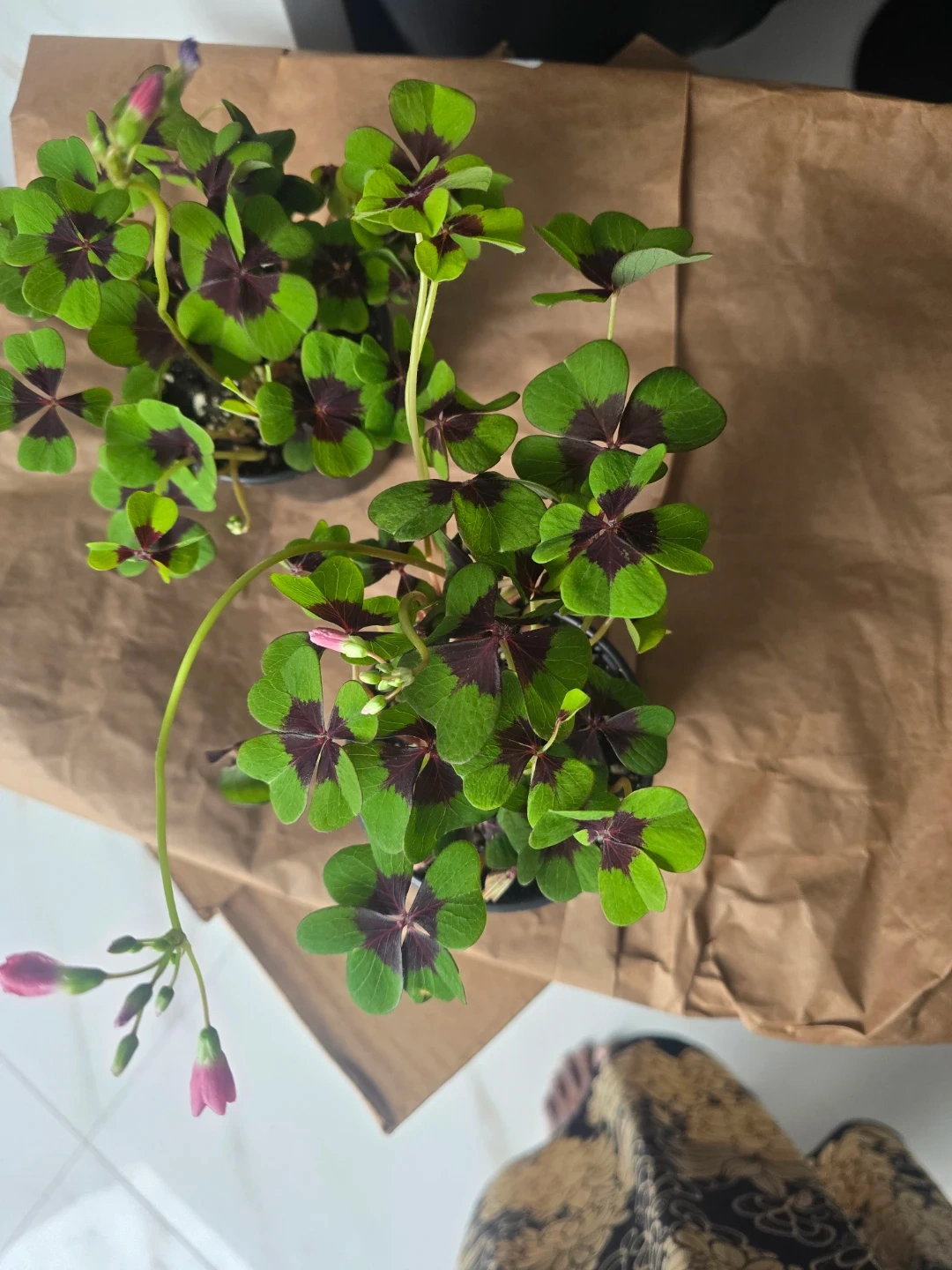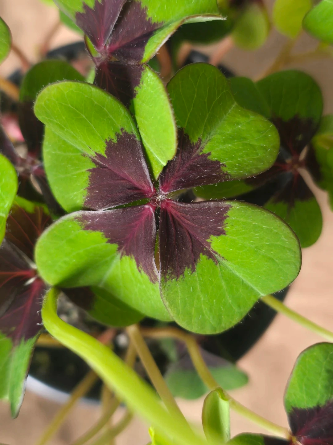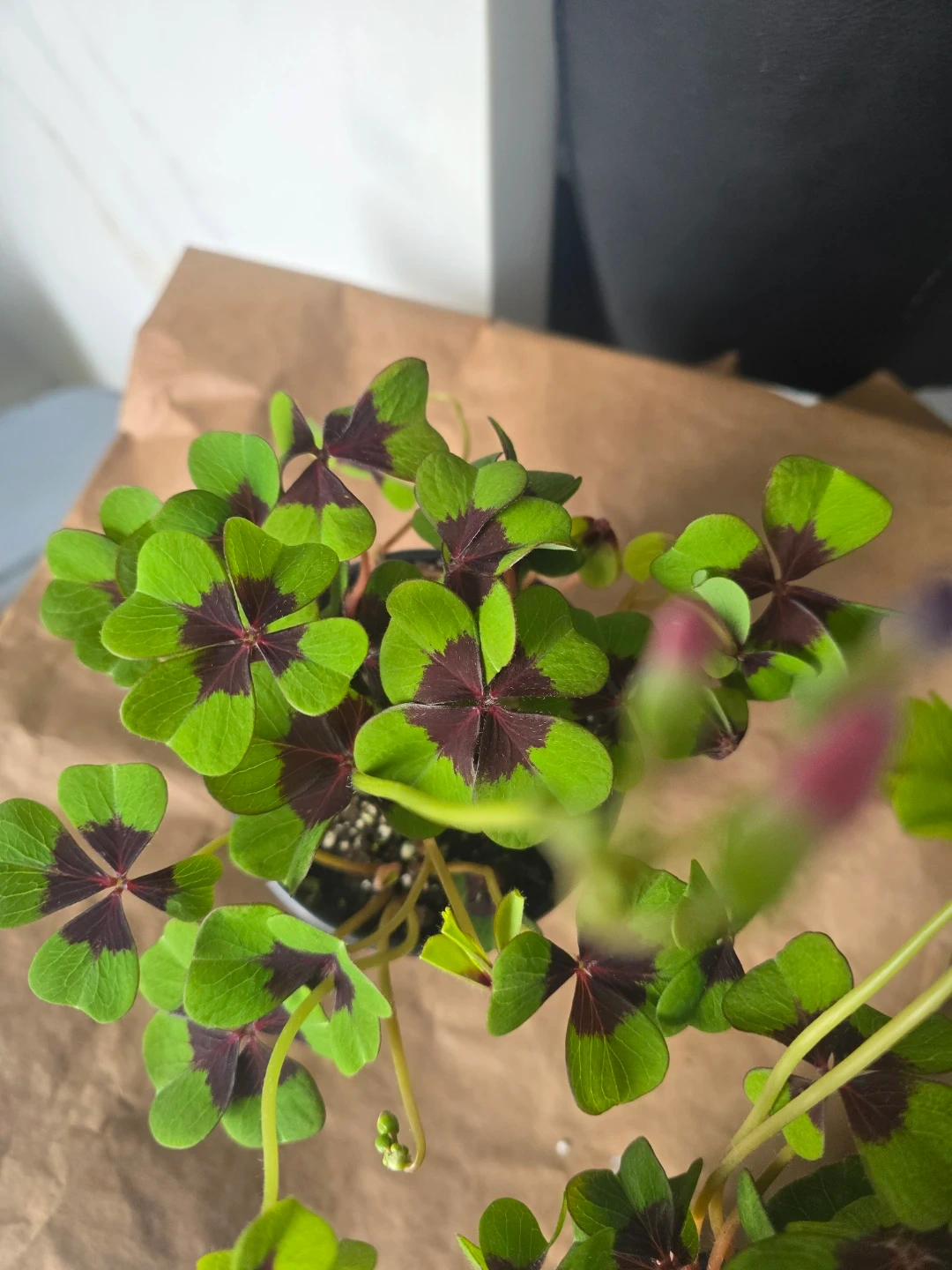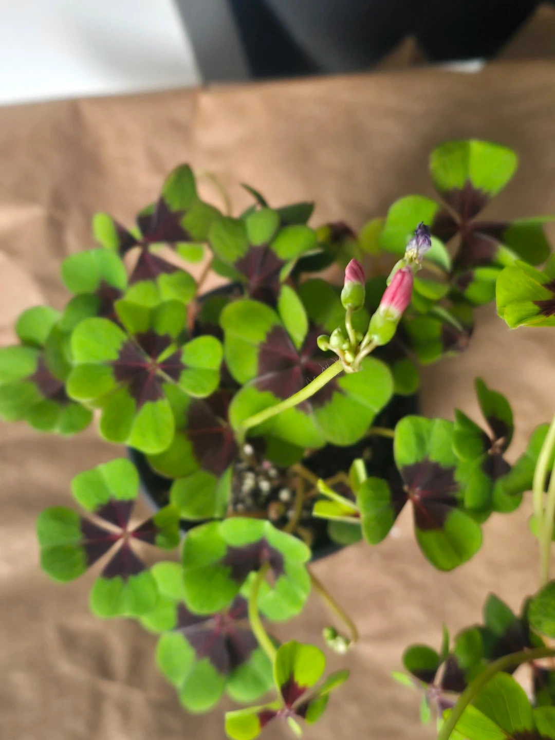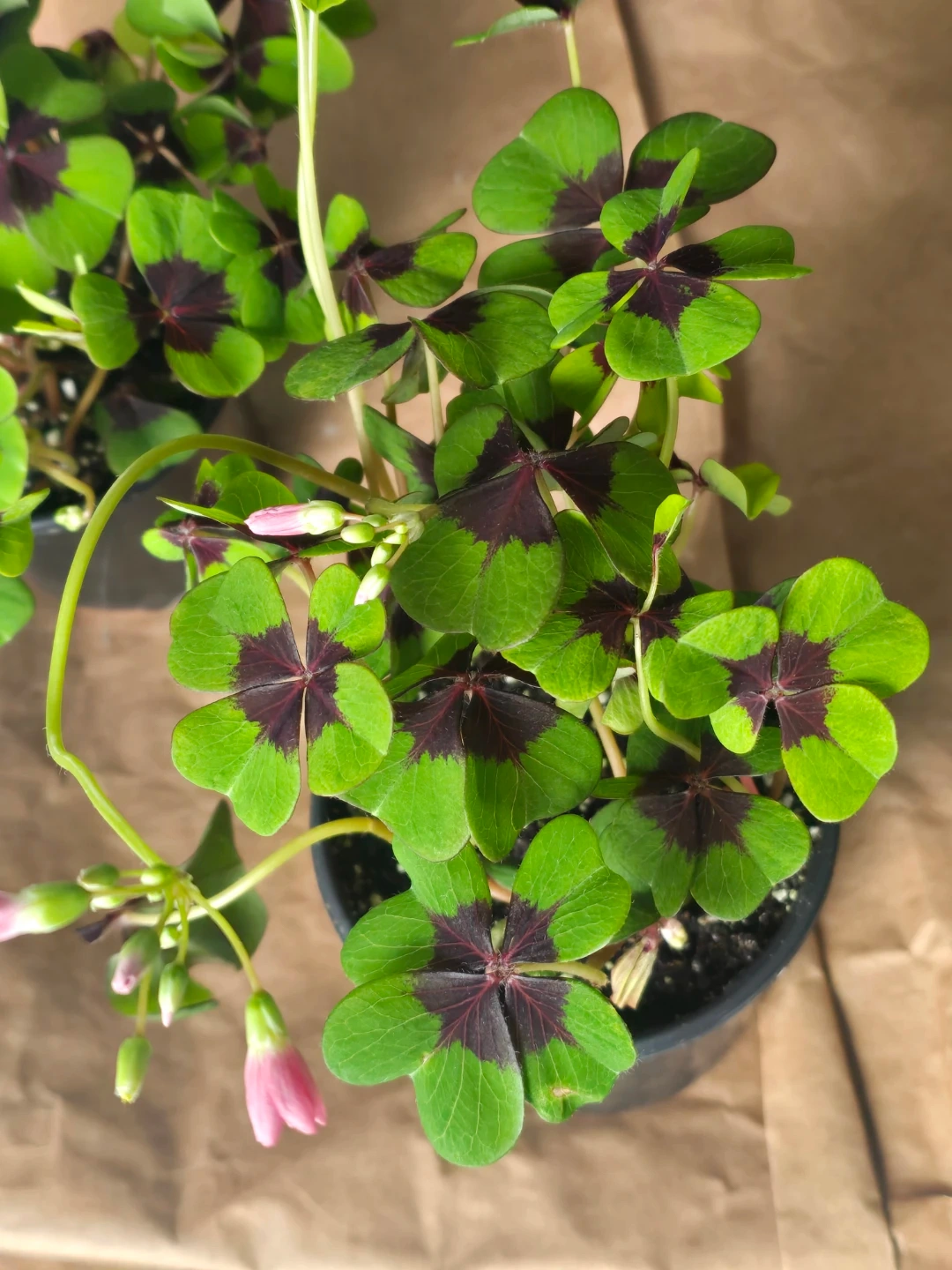 Shamrock plant with distinctive four-leaf clover shape. Features vibrant green leaves with deep purple centres and delicate pink buds. It's a lovely plant for adding a touch of nature indoors. This plant thrives in bright, indirect light.