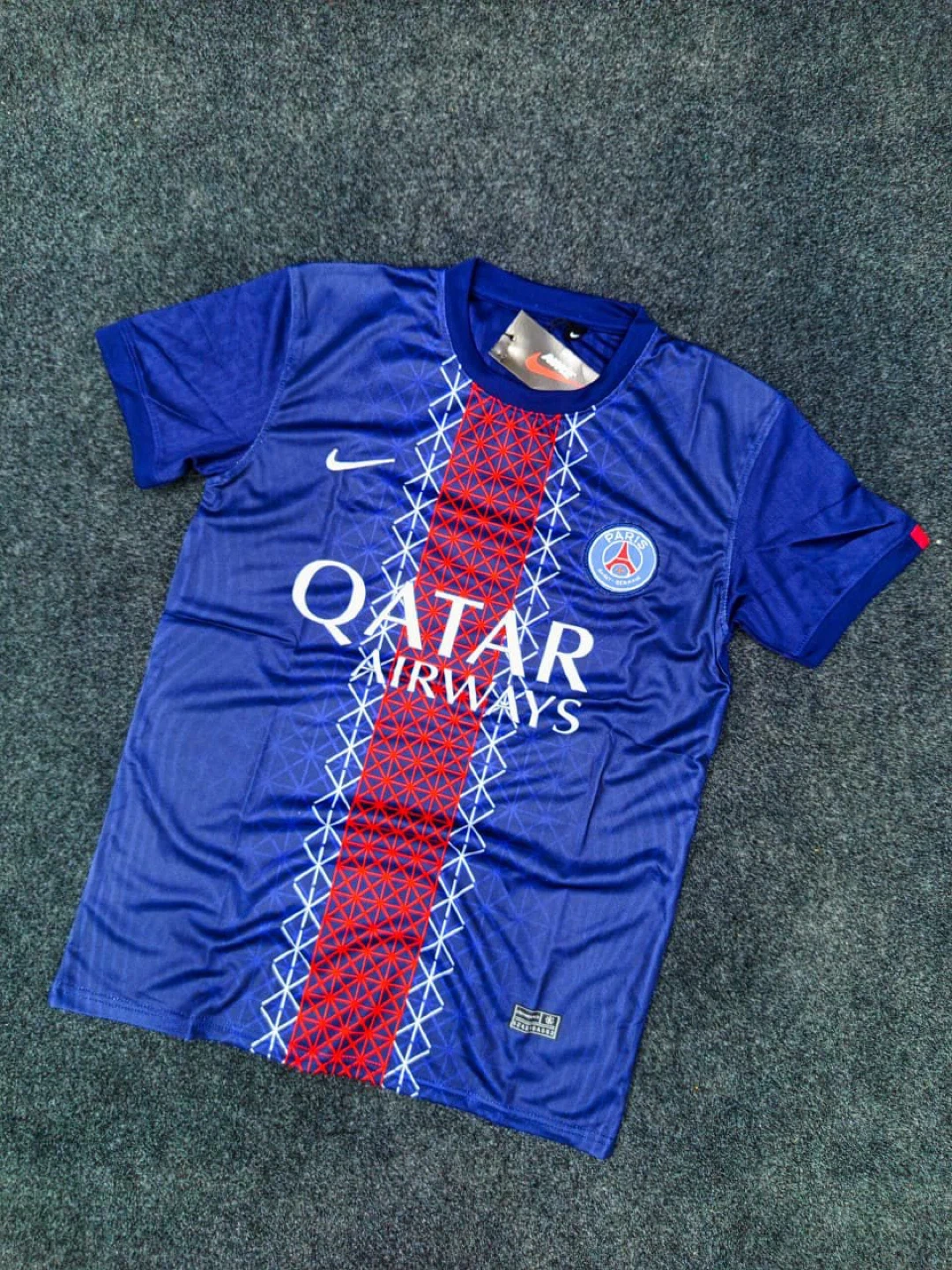 This is a Paris Saint-Germain football jersey made by Nike. It features the Qatar Airways sponsorship. Blue color.