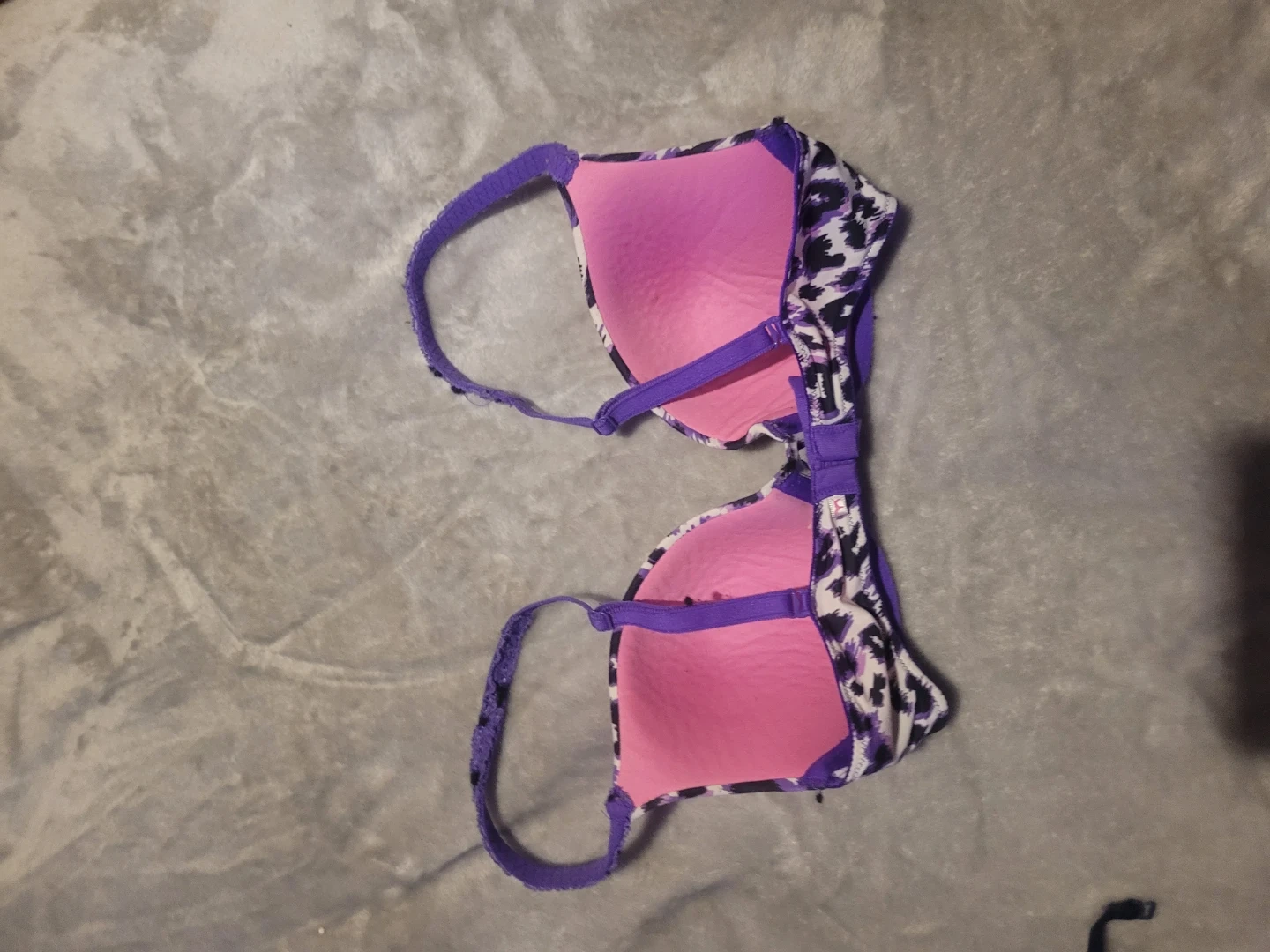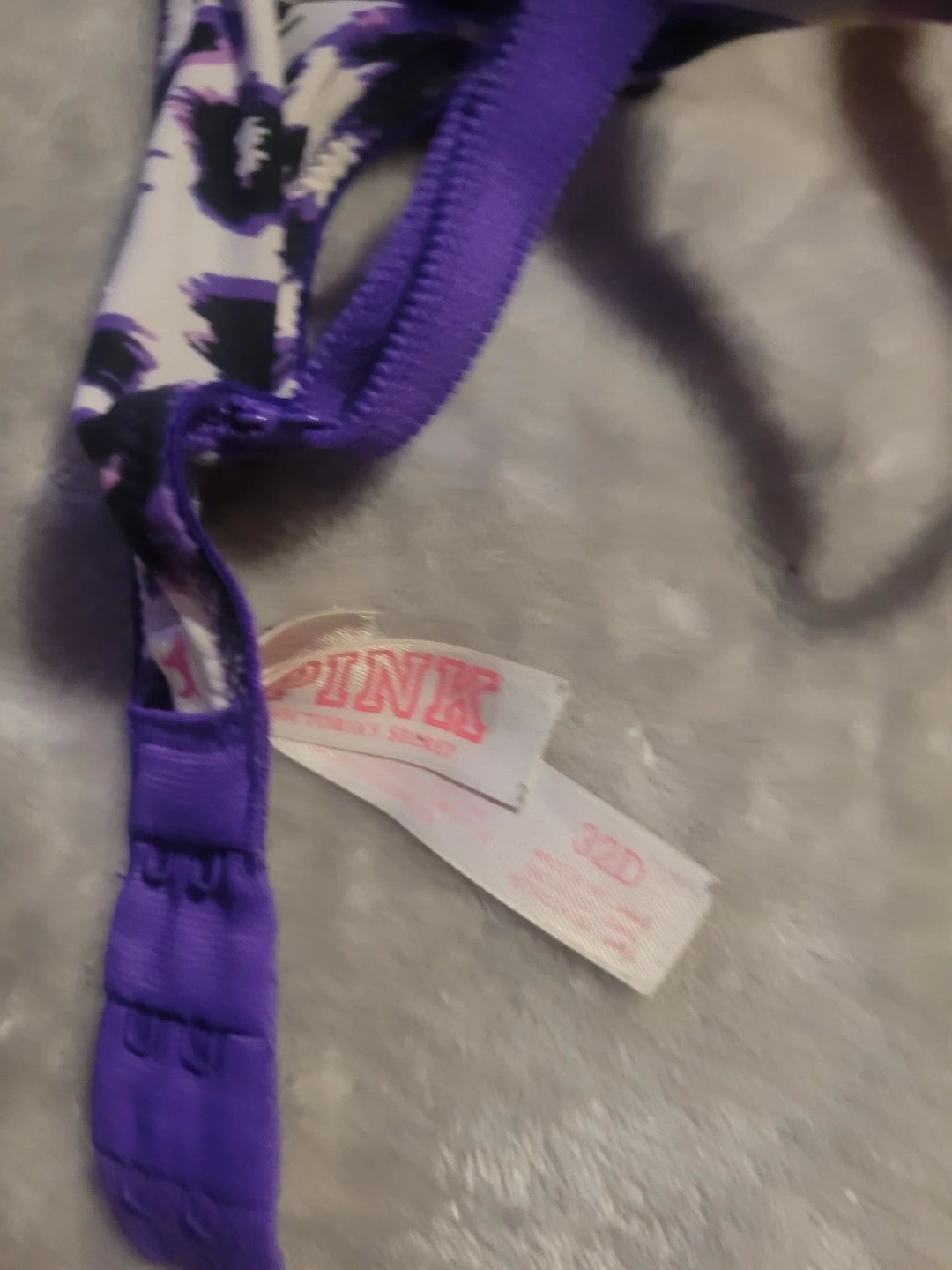 Victoria's Secret PINK push-up bra in a purple leopard print. Features adjustable straps and a 32D size. Comfortable and stylish for everyday wear!
