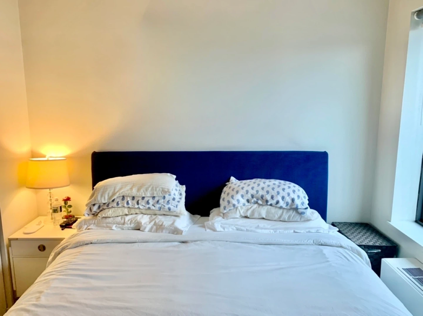 A King Sized blue upholstered headboard. It attaches behind the bed frame. Headboard is a deep navy blue color, upholstered. (Cover can be removed).