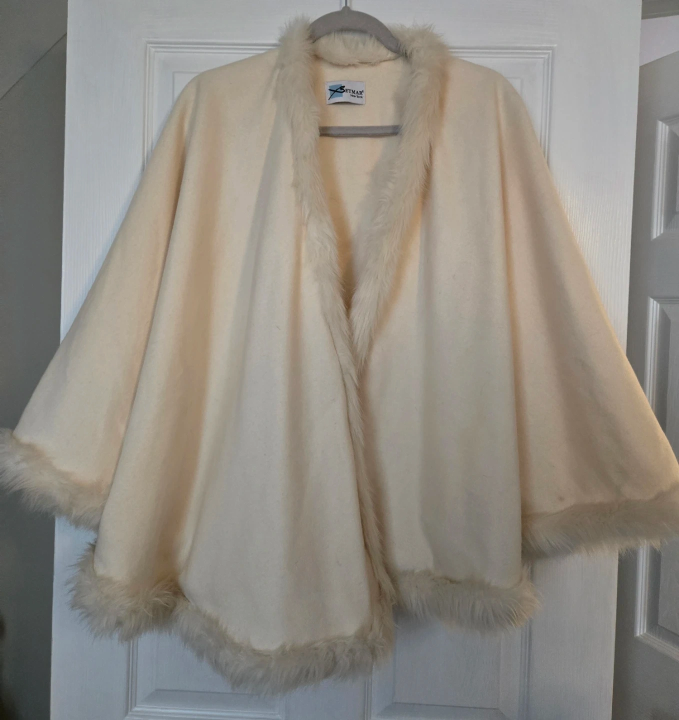 Elegant cream cape by Betmar. Features a soft faux fur trim around the neckline and hem. It's perfect for adding a touch of warmth and style to any outfit. Offers a comfortable, one-size-fits-most silhouette.