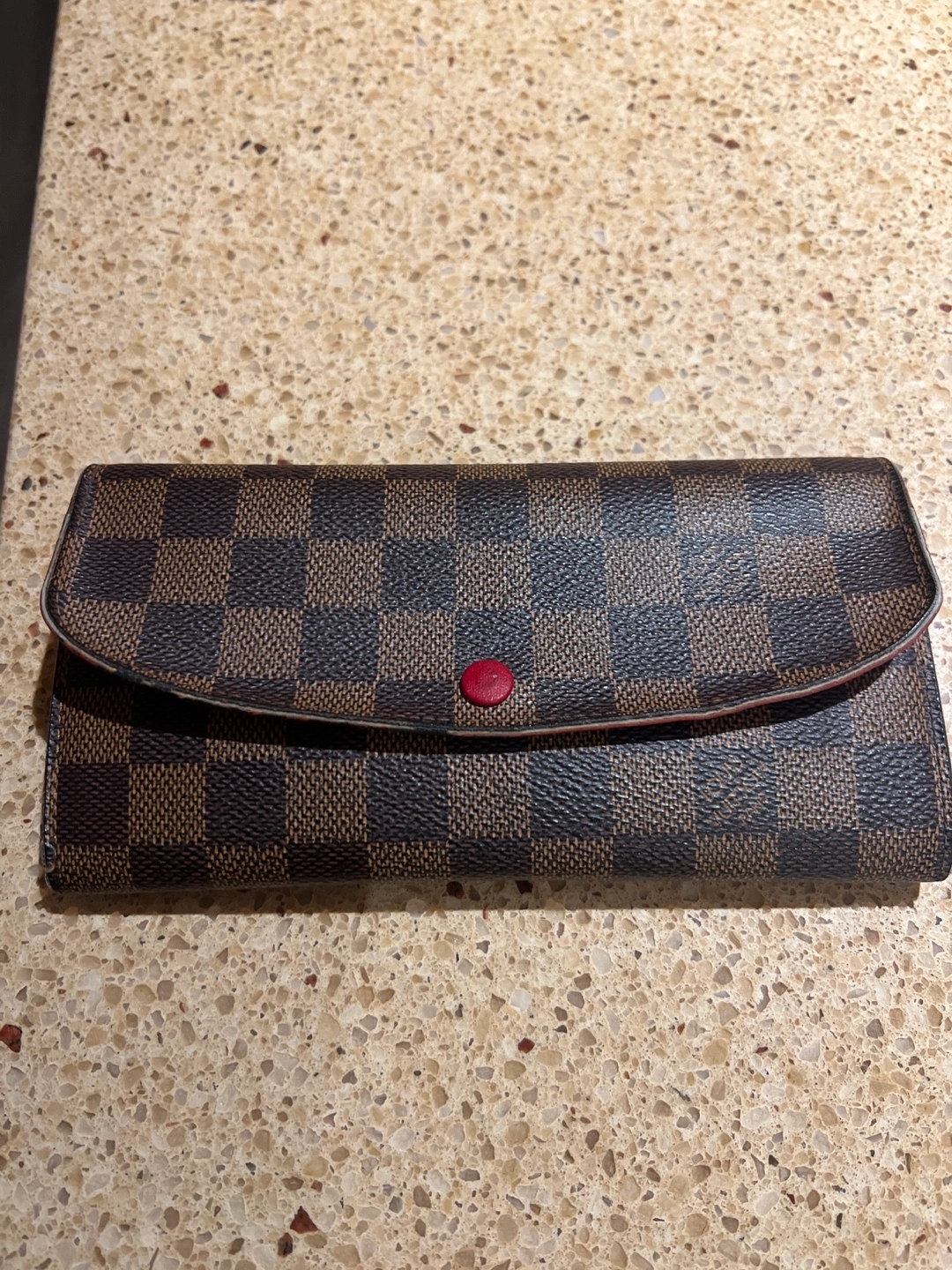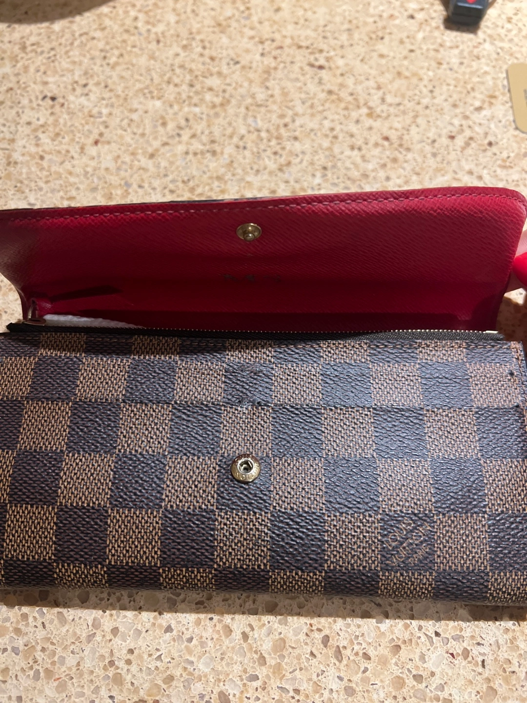 Brown and beige Damier Ebene canvas. Red leather interior. Snap closure. Multiple card slots and compartments.