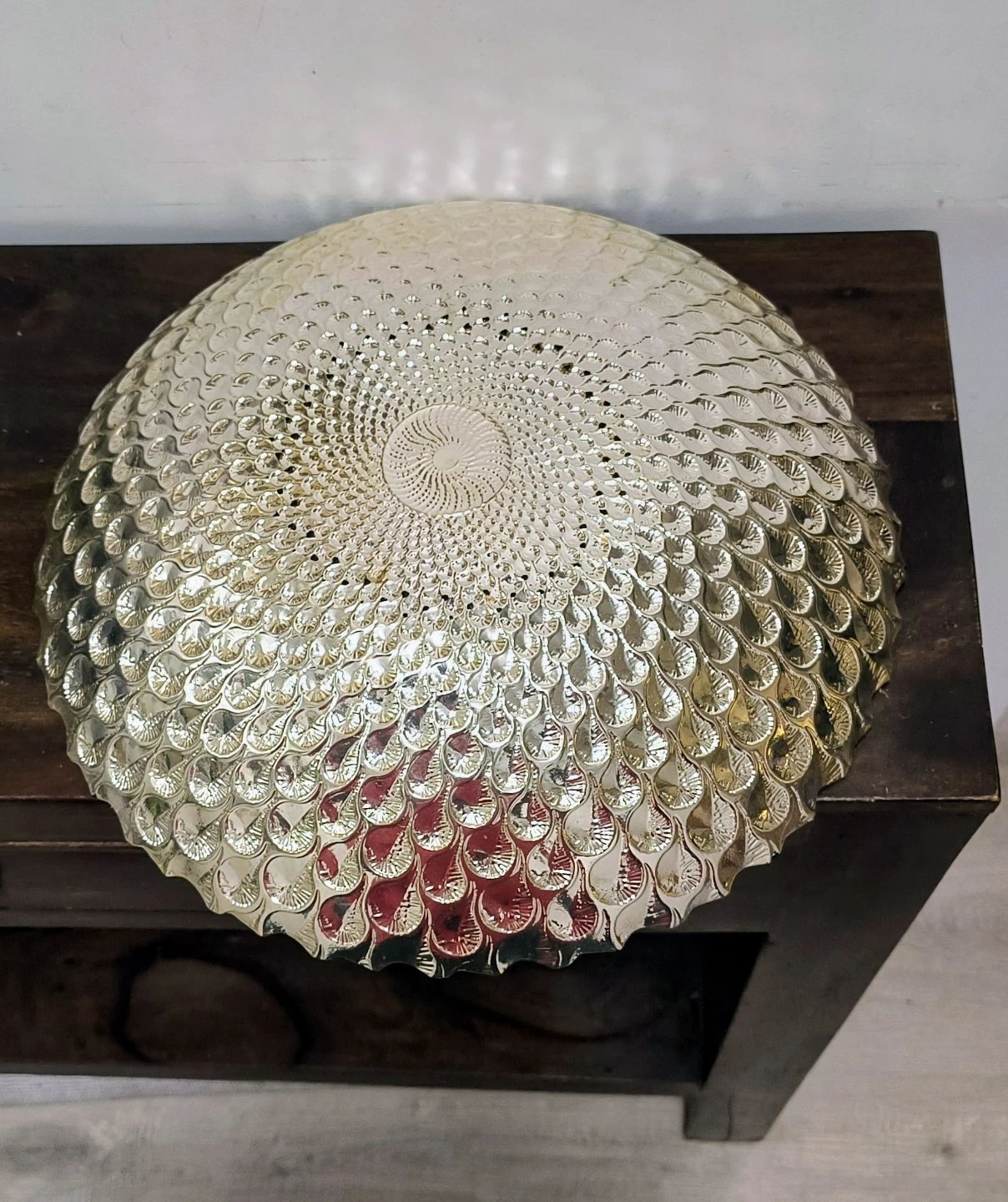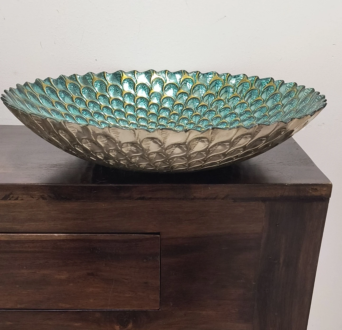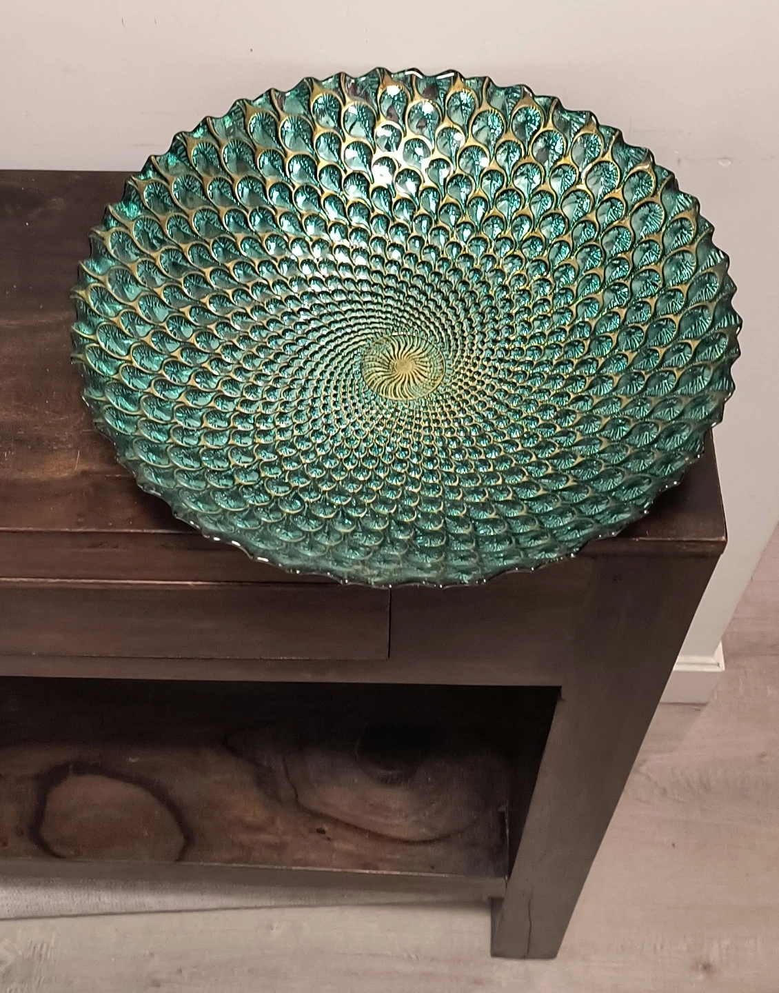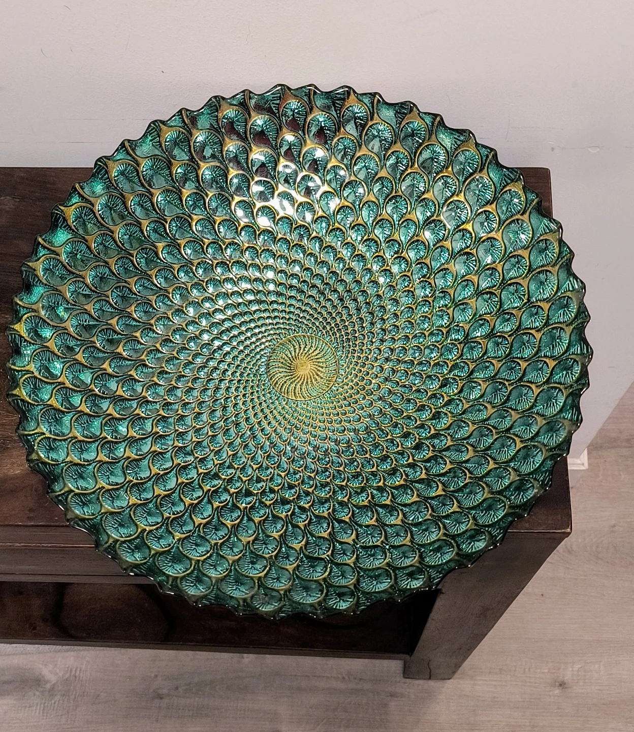 Beautiful decorative glass bowl with a unique peacock feather pattern. It's a striking piece for any home. Measures 15 inches in diameter.
