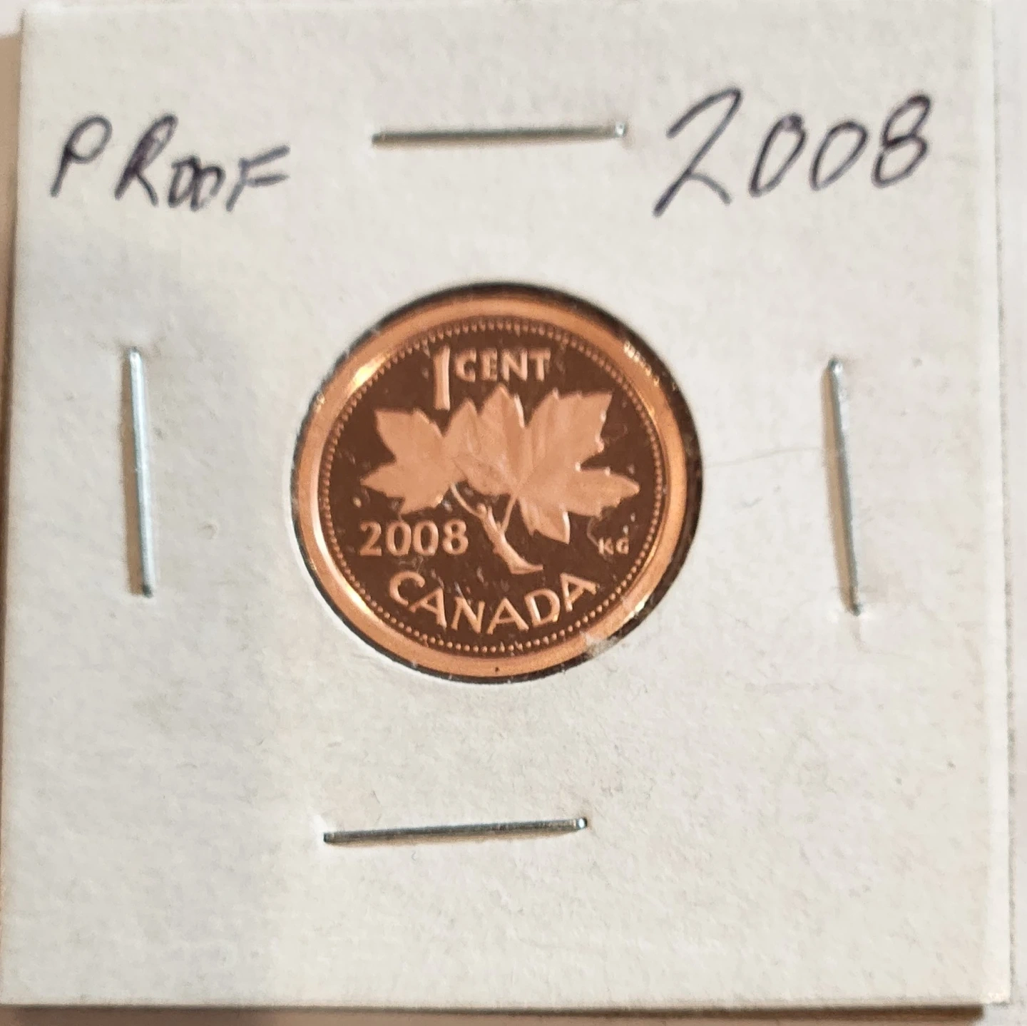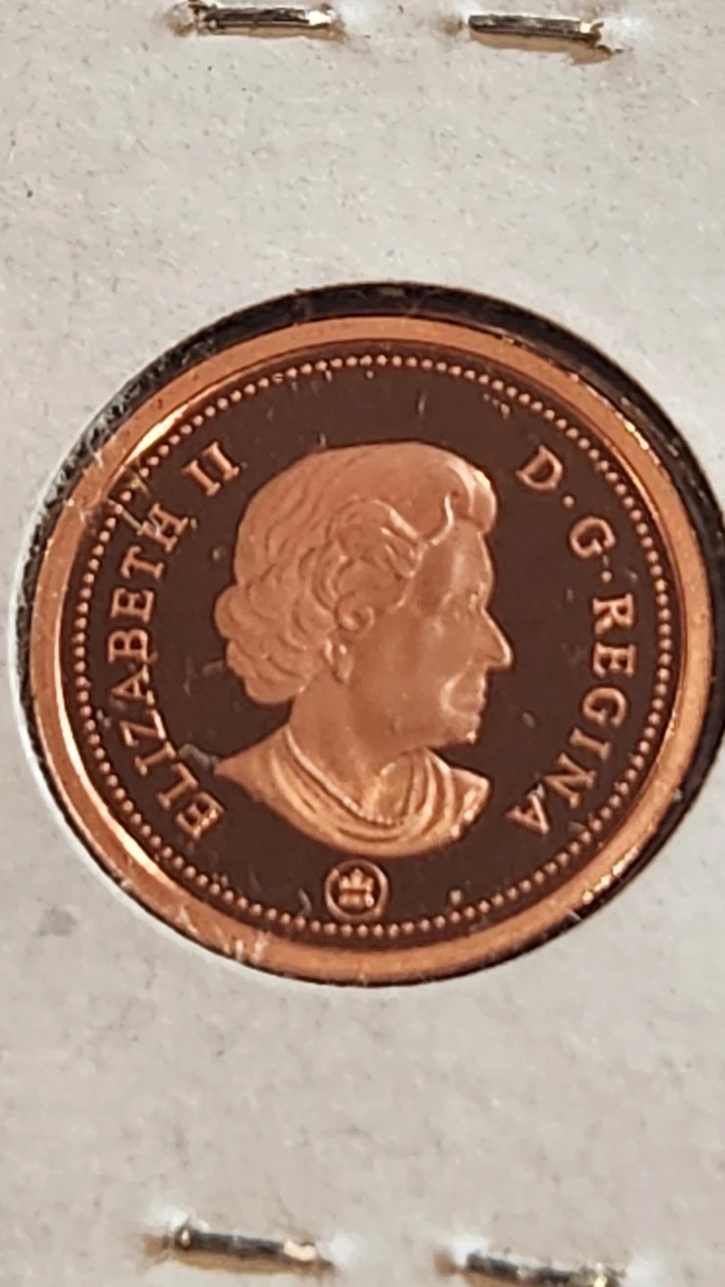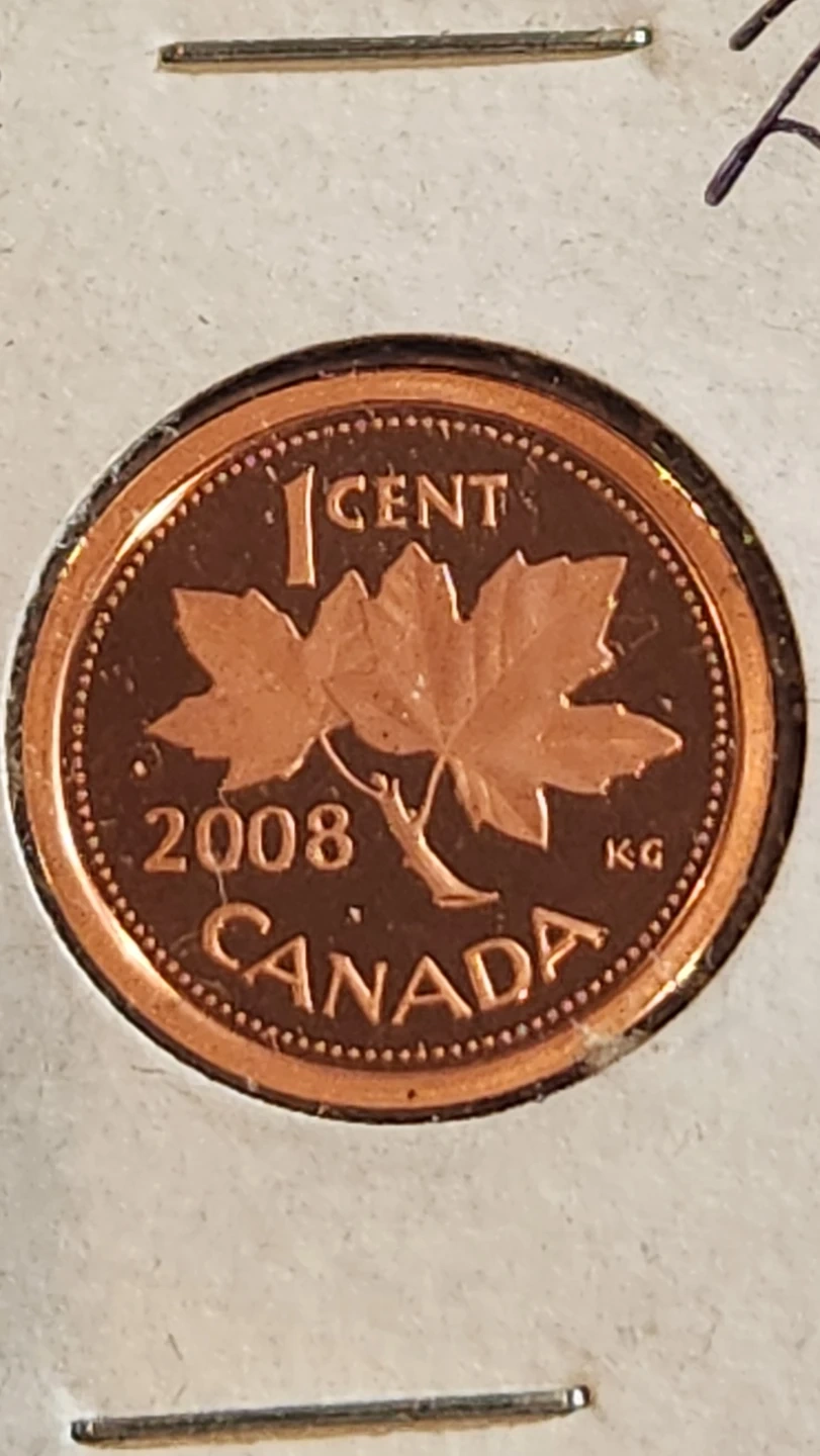 This is a 2008 Canadian 1 cent proof coin. It features a maple leaf on one side and Queen Elizabeth II on the other. The coin is in excellent condition. Its a non magnetic variety hard to find penny.
