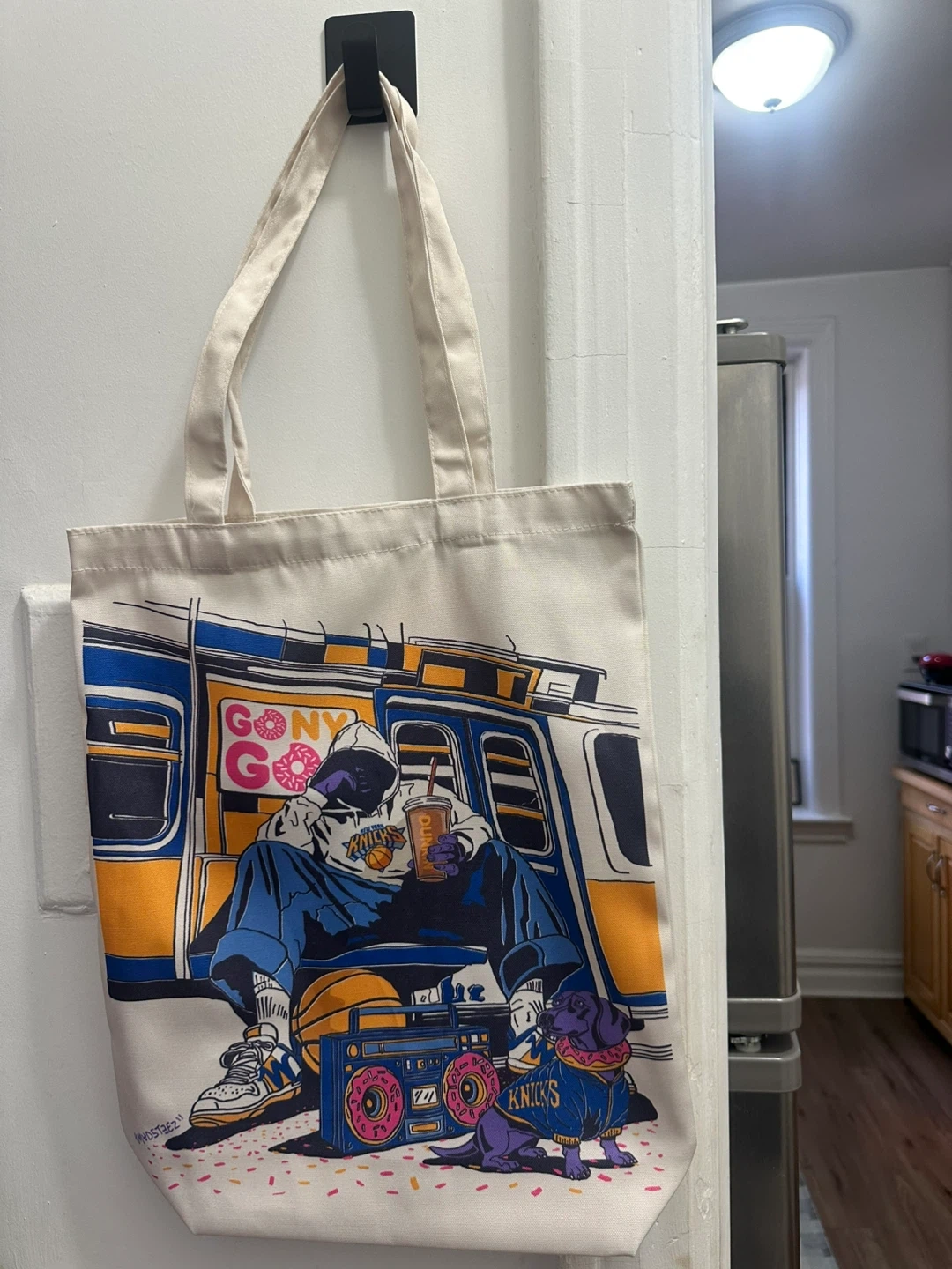 Cream canvas tote bag featuring a graphic print with Dunkin' and Knicks motifs. This tote is great for everyday use!