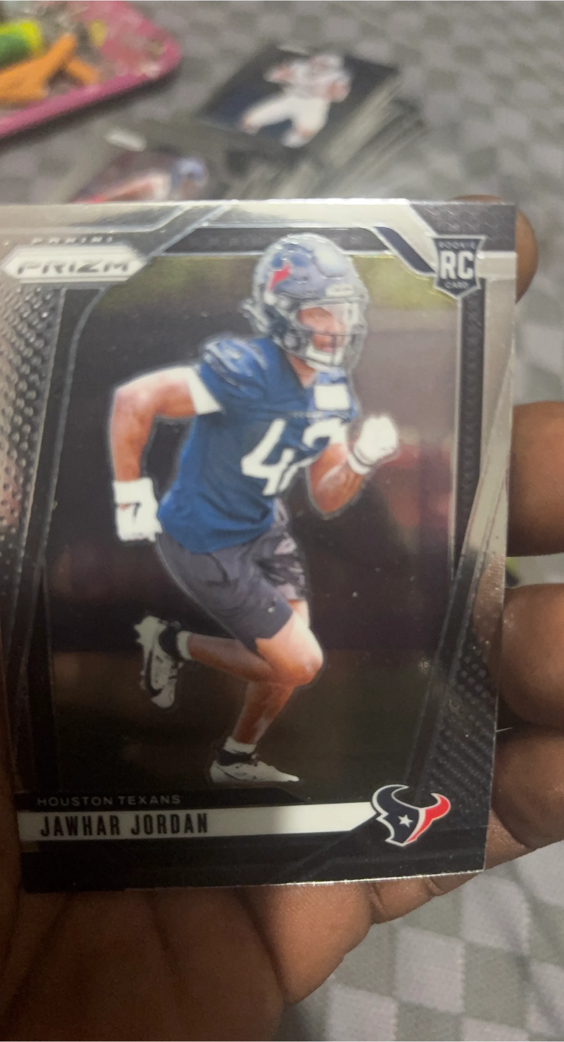 This is a Panini Prizm Rookie Card featuring Jawhar Jordan of the Houston Texans. It's a collectible item for football fans. The card includes the 'RC' designation, indicating it's a rookie card.