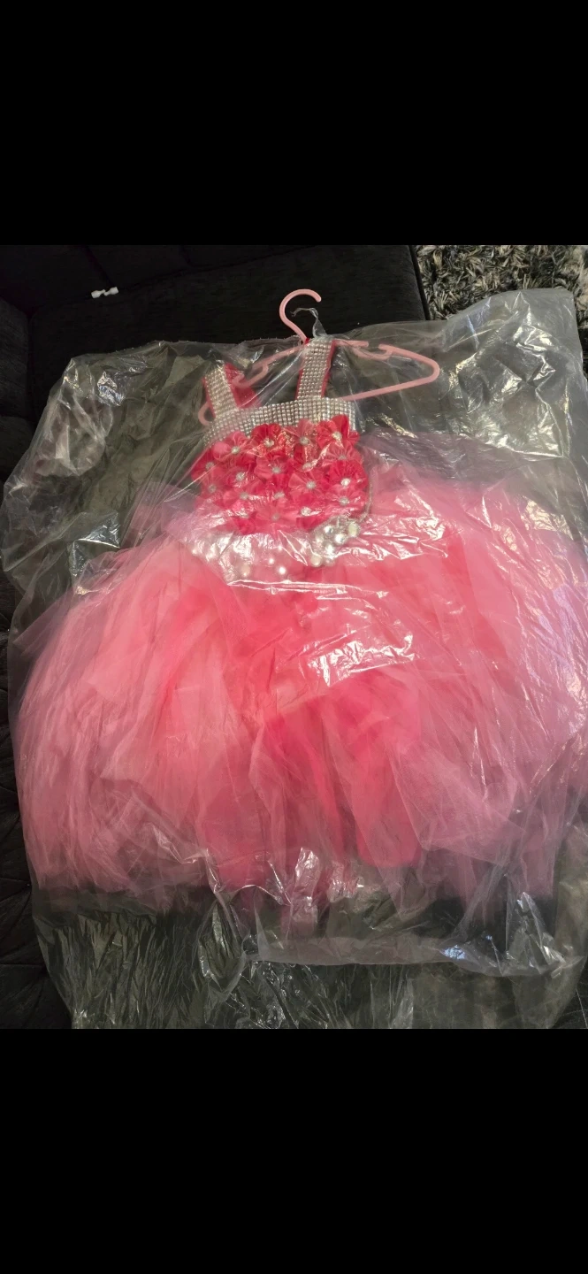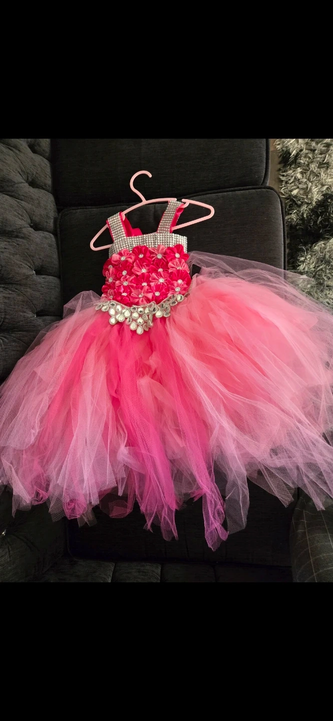 This adorable pink tutu dress is perfect for a little one! The dress features a beautiful design with flower and pearl accents. Just wore once. Perfect for 1 year bday