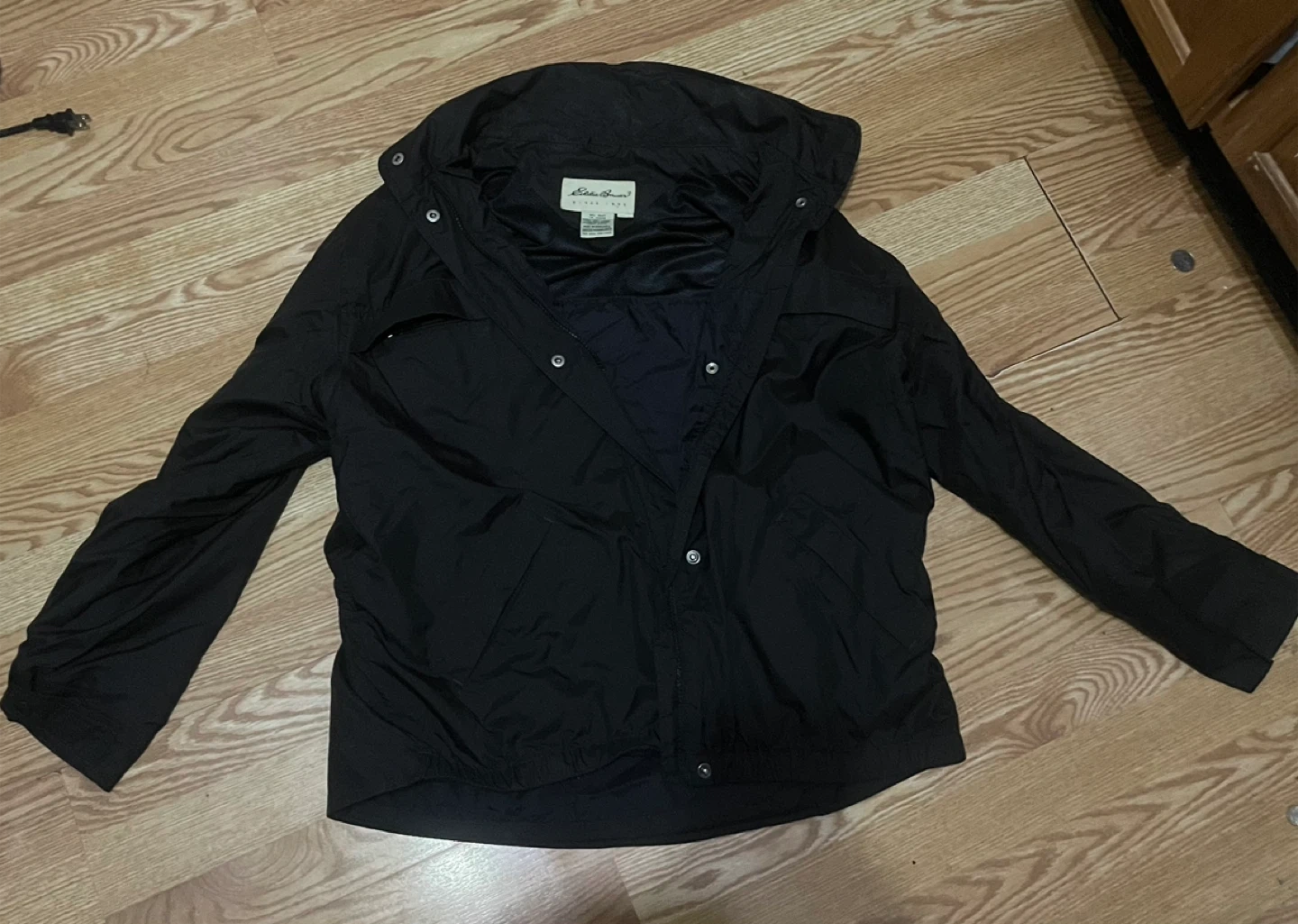 Eddie Bauer black hooded jacket with snap closures. It's made of nylon and polyester. This jacket offers good protection from the elements.