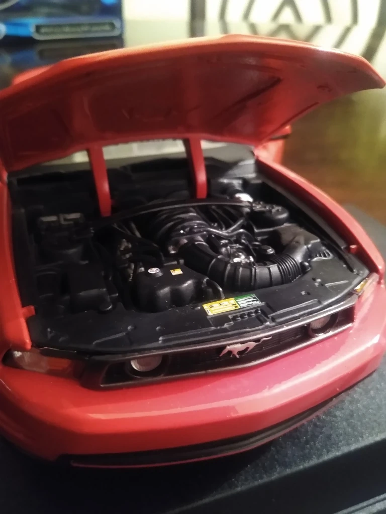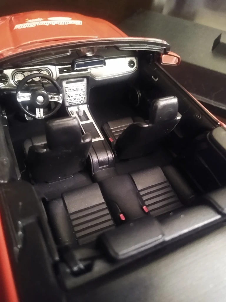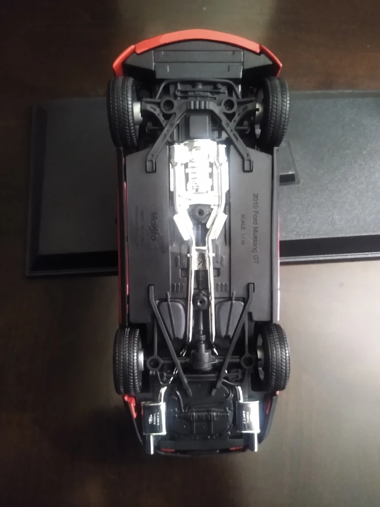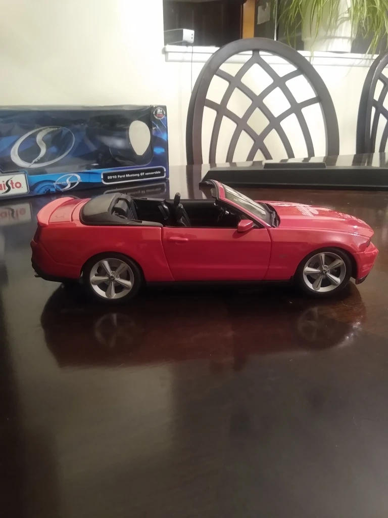 This is a 1:18 scale diecast model of a red 2010 Ford Mustang GT convertible. The doors, hood, and trunk open. It's in excellent condition and comes with its original box. This model's realistic details make it a great display piece!