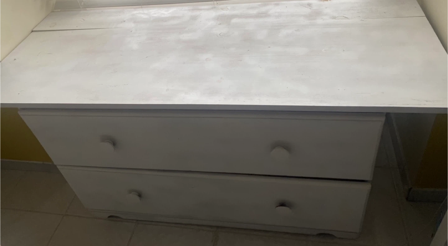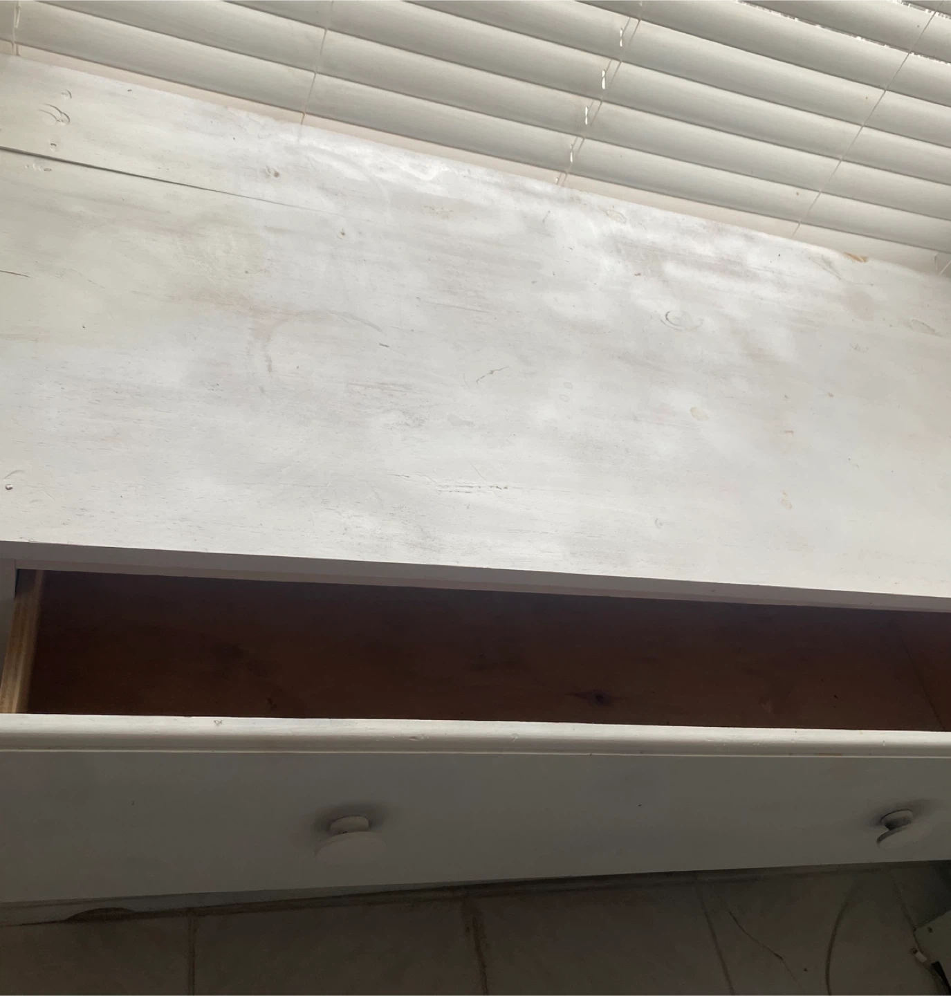 Selling a hand painted white dresser with drawers. It's in good condition and perfect for extra storage in a bedroom or closet