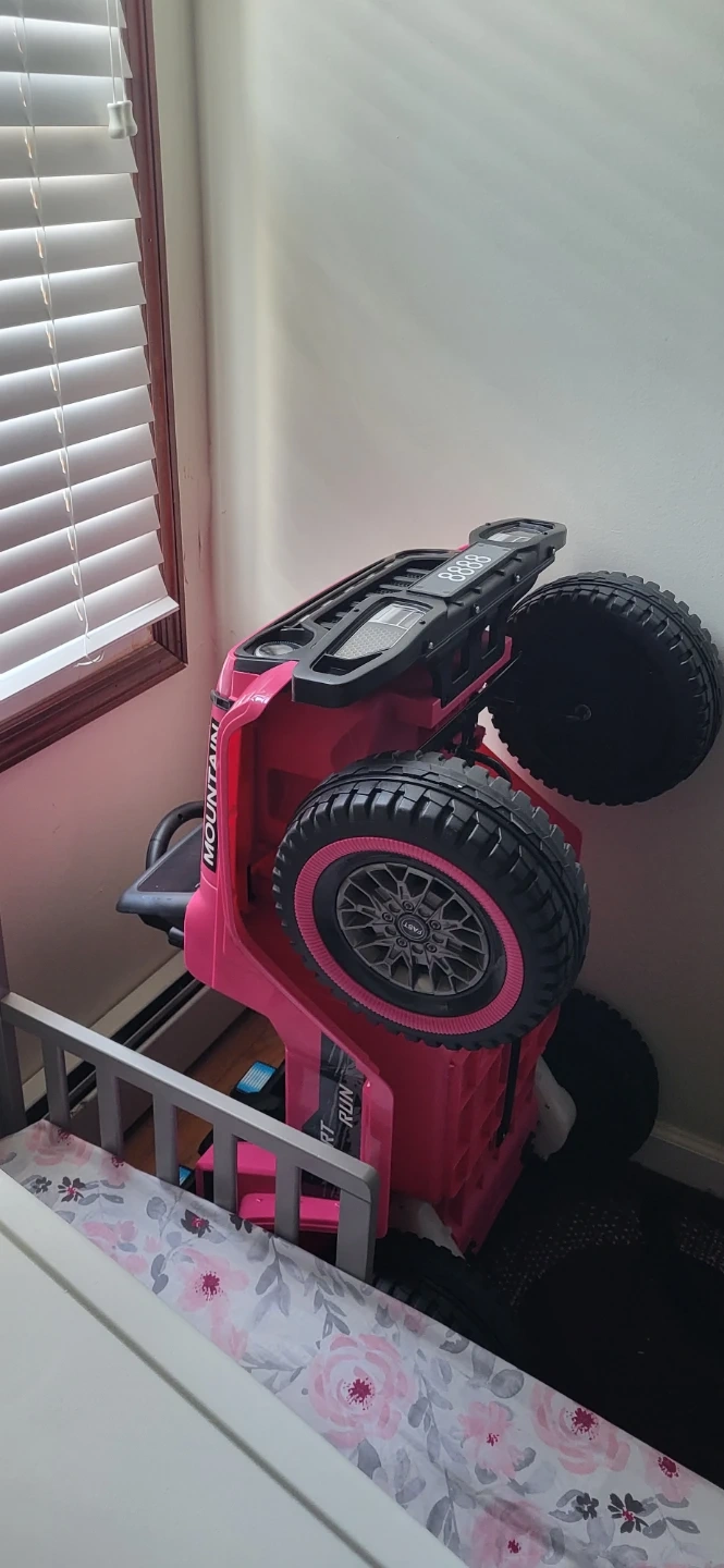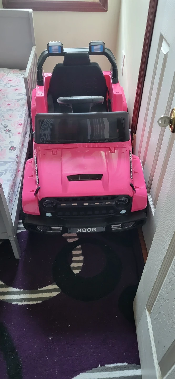 This bright pink ride-on electric jeep is perfect for little adventurers. It features a realistic design with working lights and a steering wheel. It's designed for outdoor fun and supervised play.