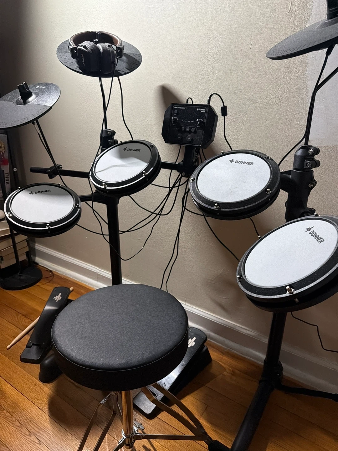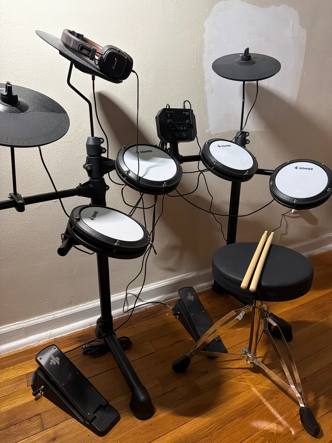 This is a Donner electronic drum kit. It includes the drum pads, cymbals, bass pedal, stool. It's a great setup for practicing or playing music.