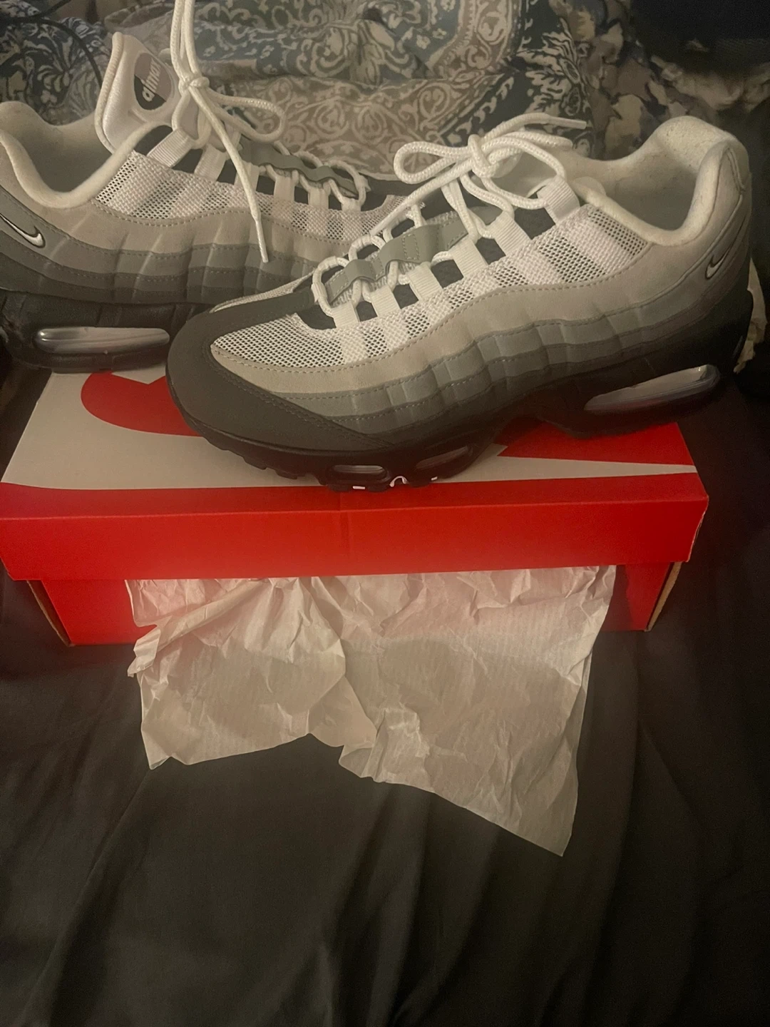These are Nike Air Max 95 sneakers. They feature a multi-layered grey and white design with a visible air unit in the sole. Includes original box. Available in men's size 8.5