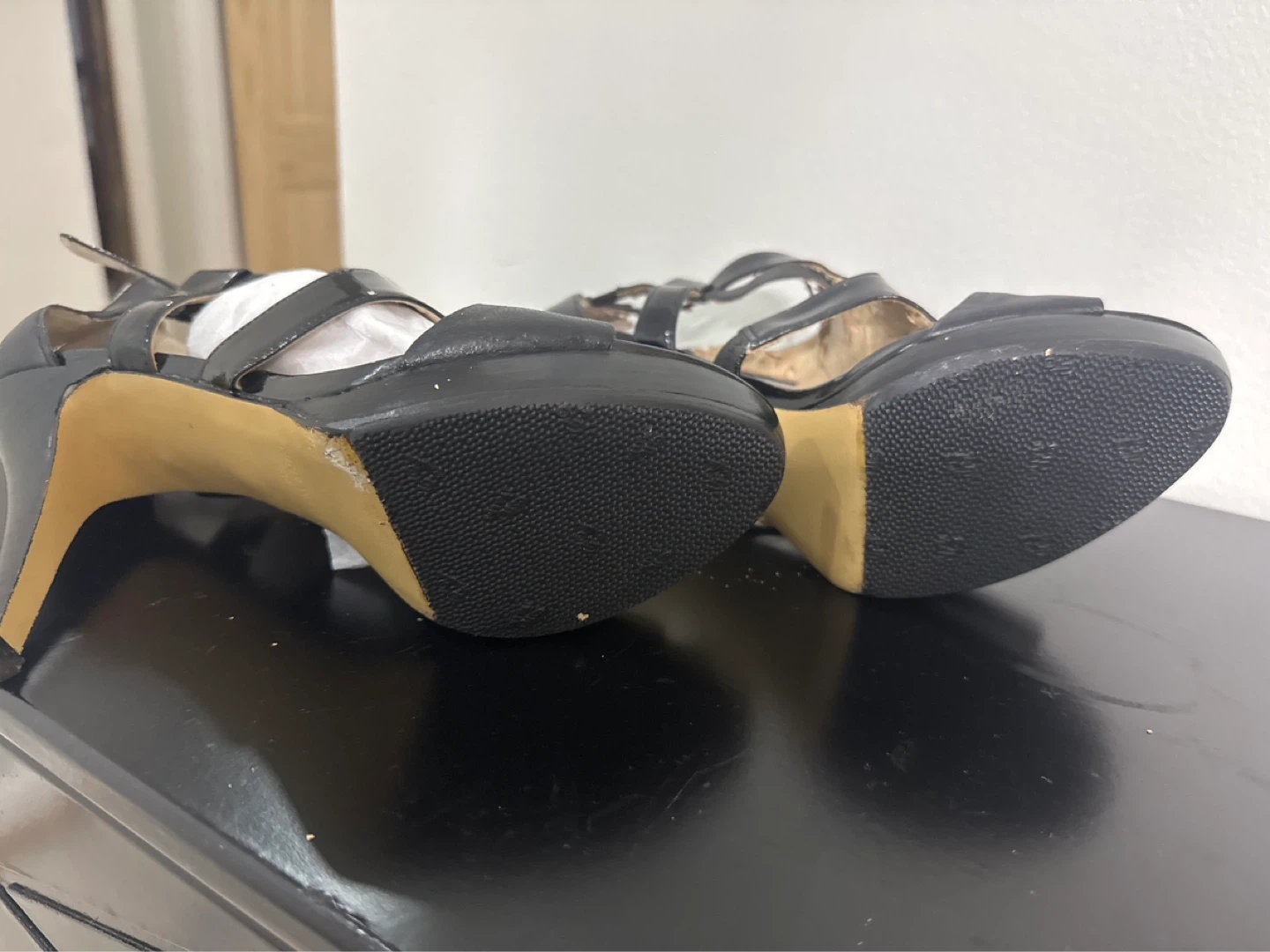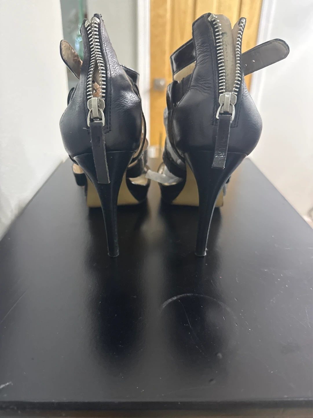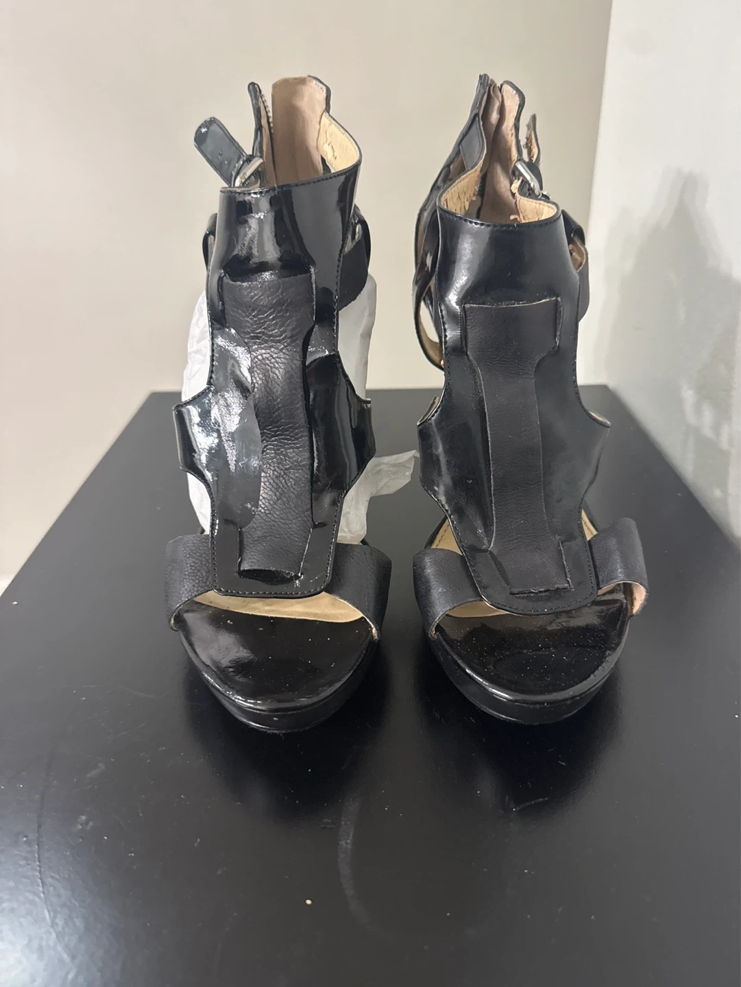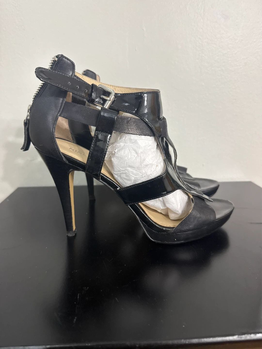 These Nine West heels feature a strappy design with a black patent and leather finish. They have a zipper closure at the back and a stiletto heel. Perfect for dressing up any outfit!