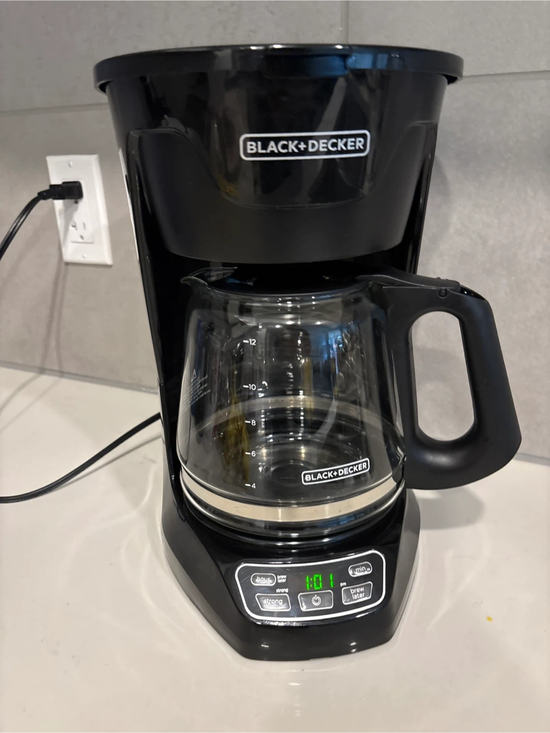 BLACK+DECKER 12-cup programmable coffee maker in black. Features brew pause and strong brew options. Includes glass carafe and filter basket. Pretty good condition, itβs ready for a new home.