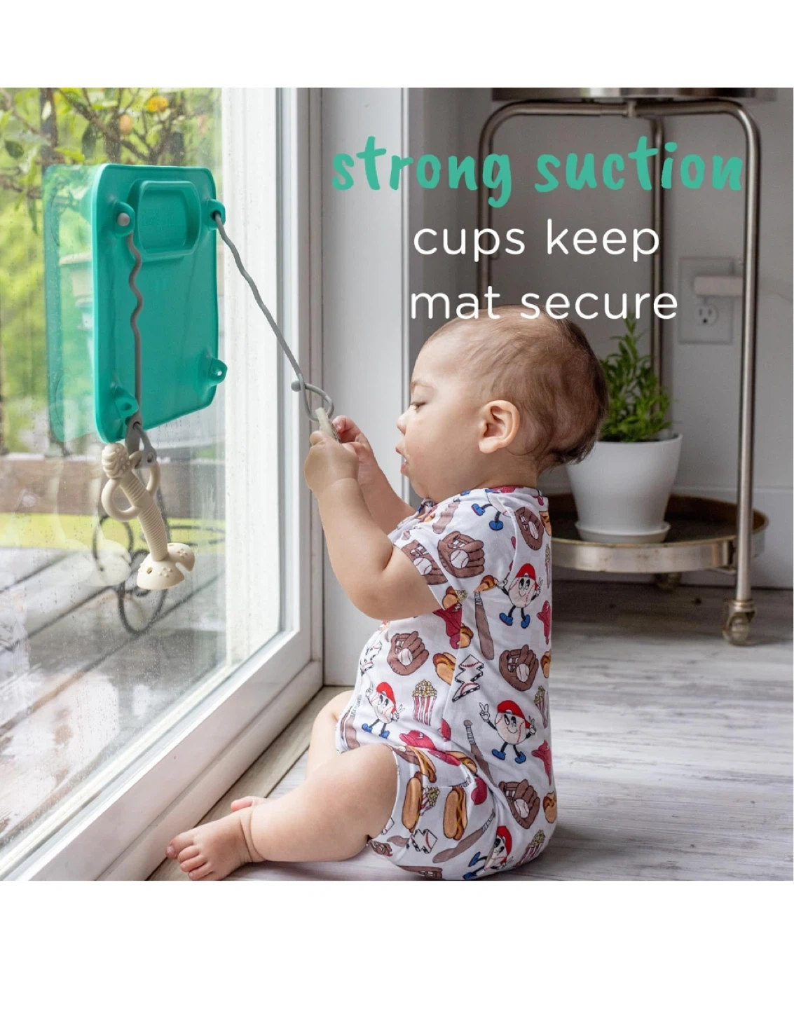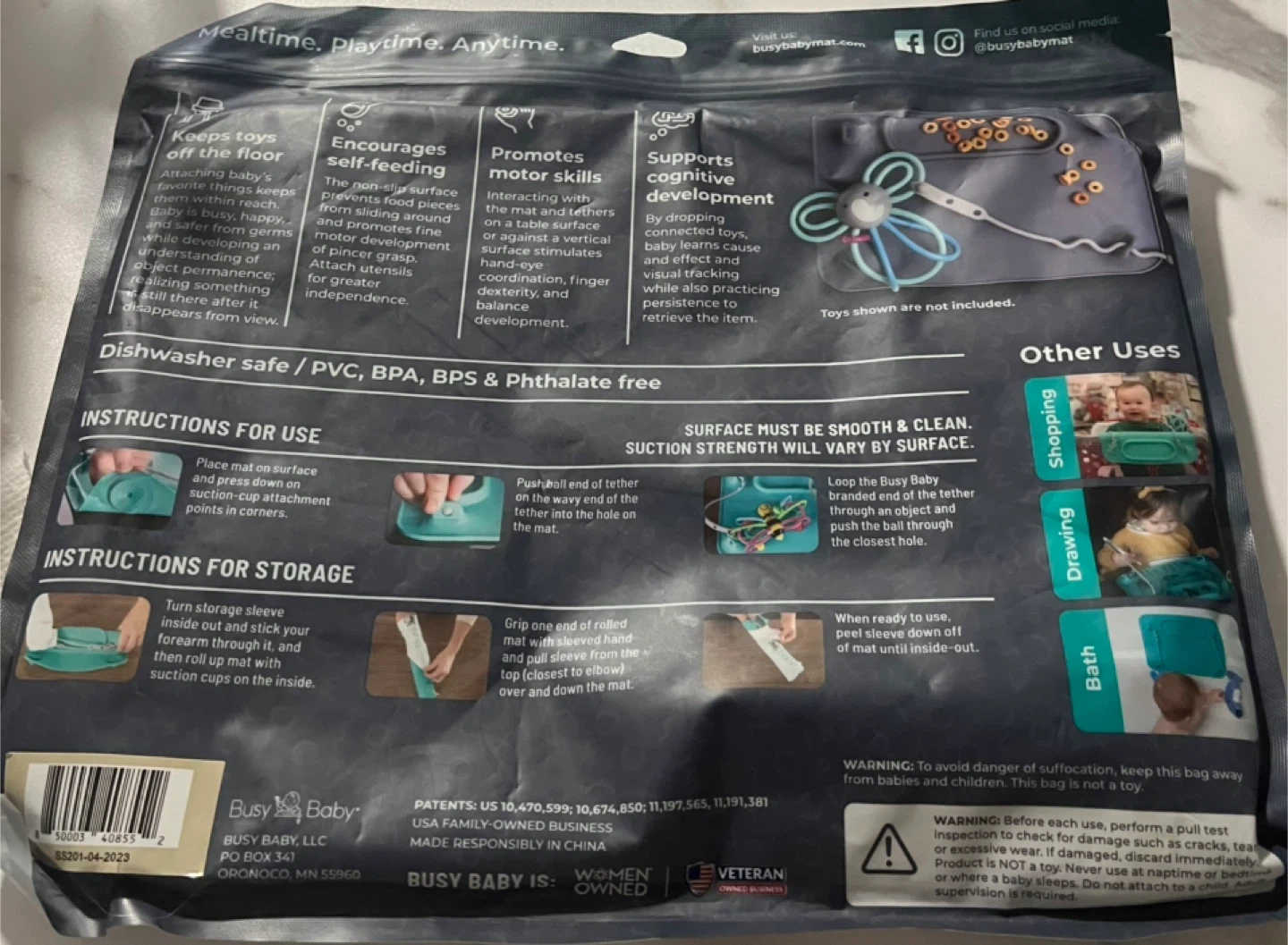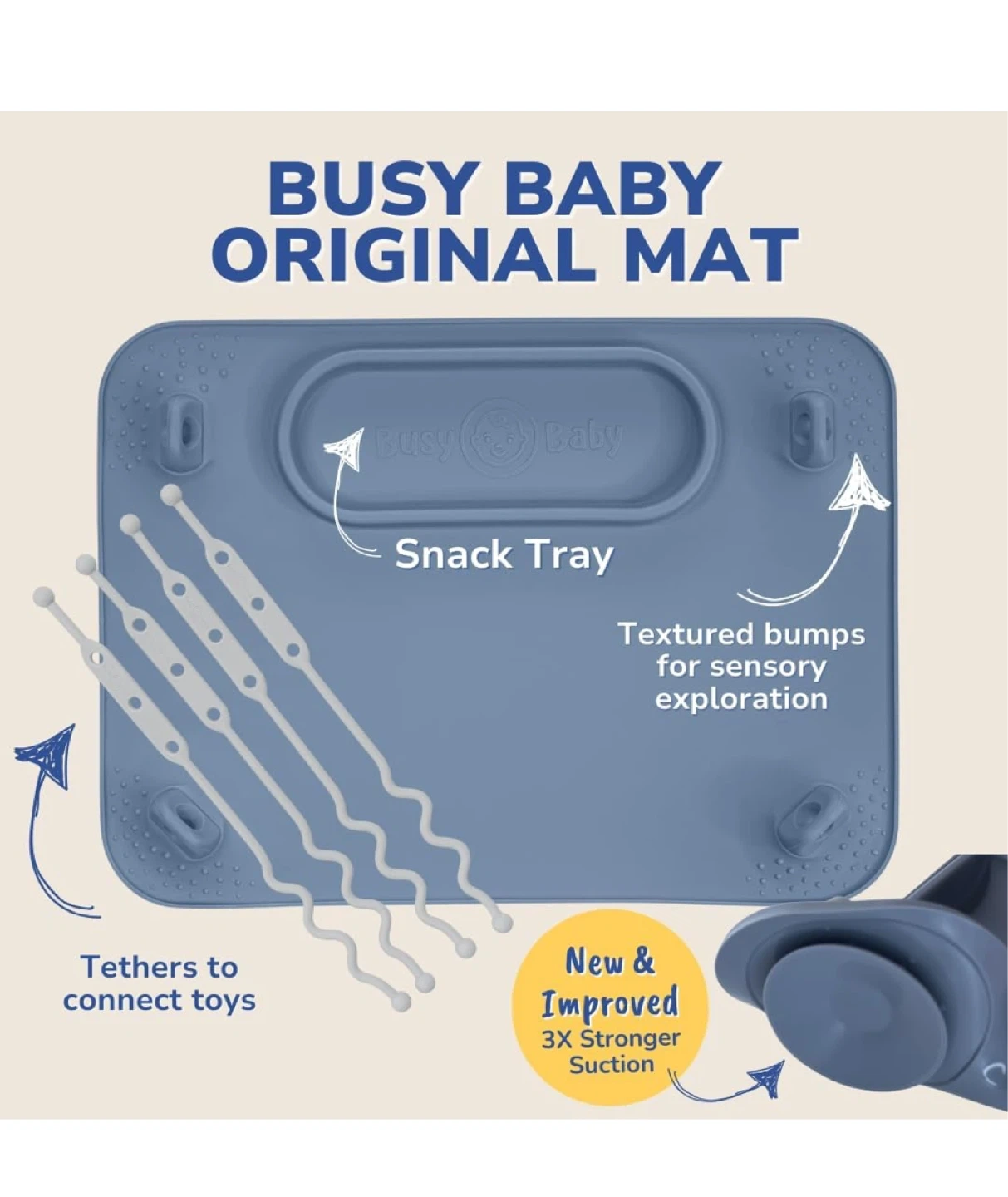 This Busy Baby Original Mat placemat and tether system is designed for mealtime and playtime. It features integrated suction cups to keep the mat secure on surfaces and tethers to connect toys. The placemat has a snack tray and textured bumps for sensory exploration.