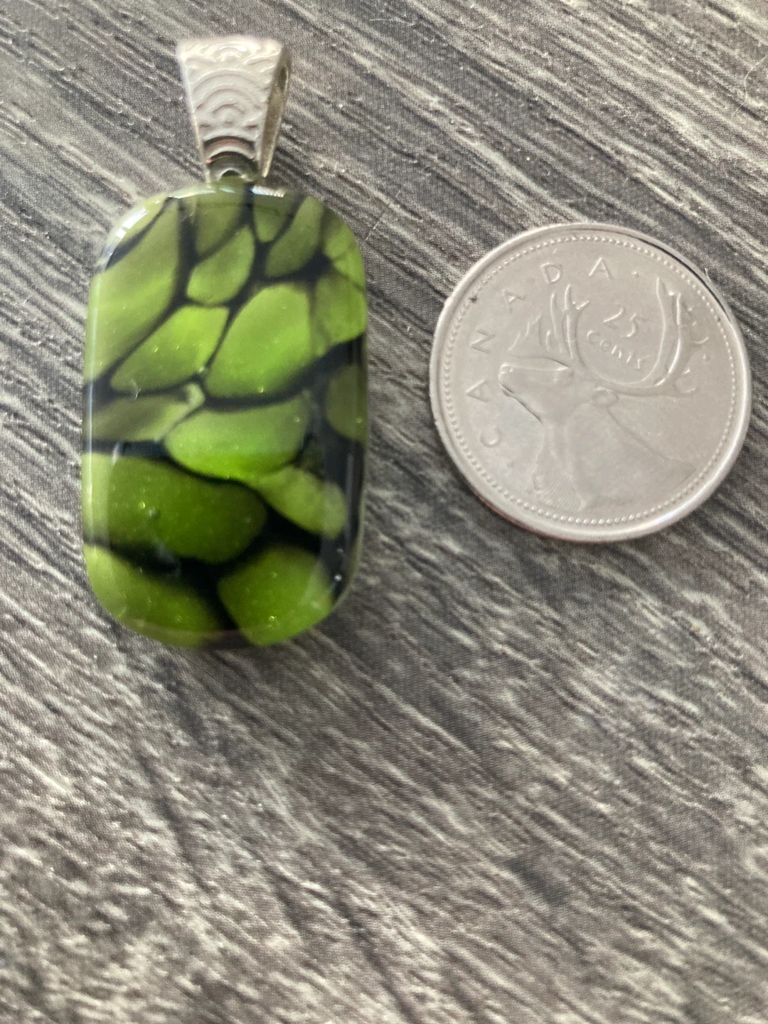 Handcrafted pendant featuring a vibrant green and black swirl design. The bail is made of a silver-tone metal. Its unique pattern makes it a statement piece!