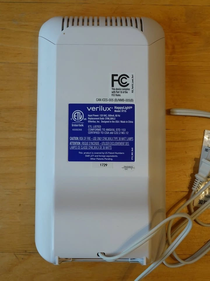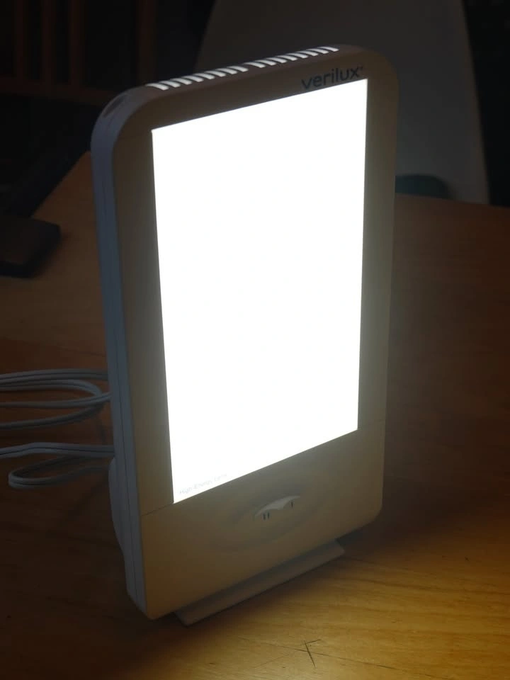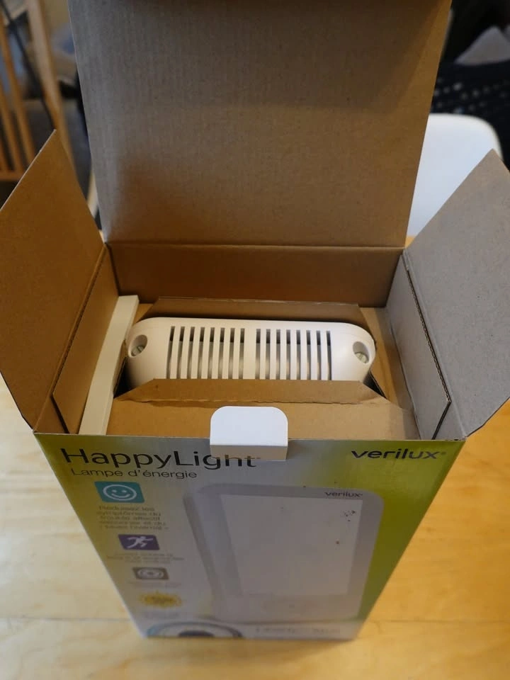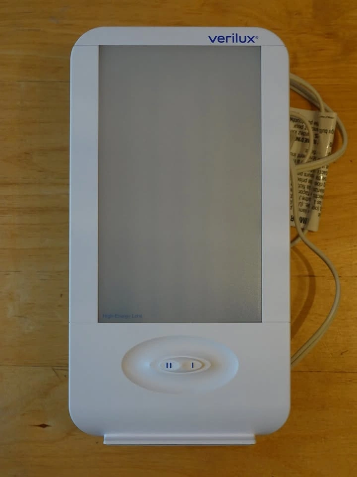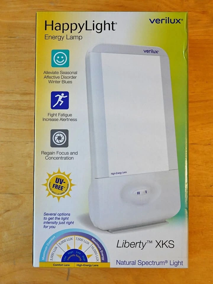 Verilux HappyLight model VT15 (Liberty XKS). Alleviates seasonal affective disorder, improves alertness and focus. Adjustable brightness, from 3,500 LUX to 10,000 LUX. Includes original box and accessories. Pickup near Fraser St and 20th Ave