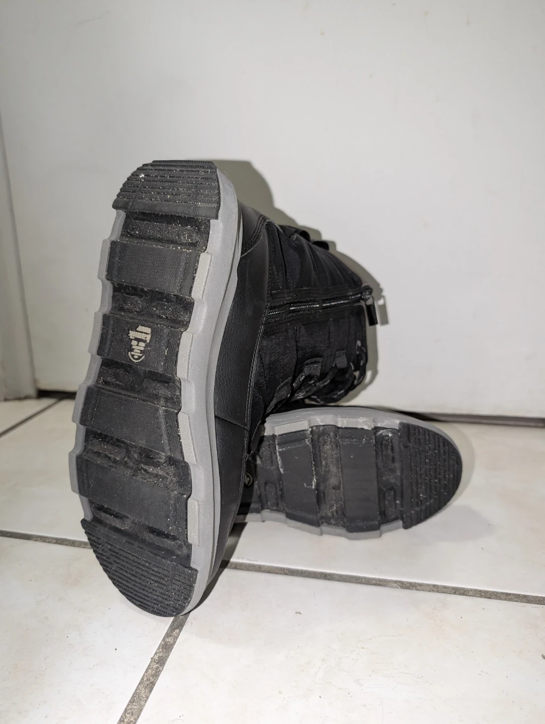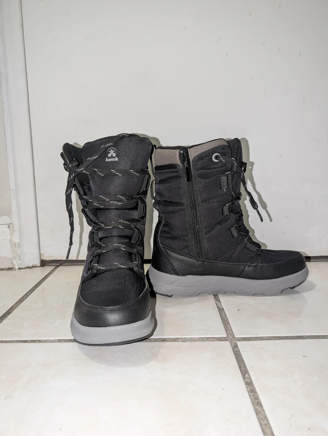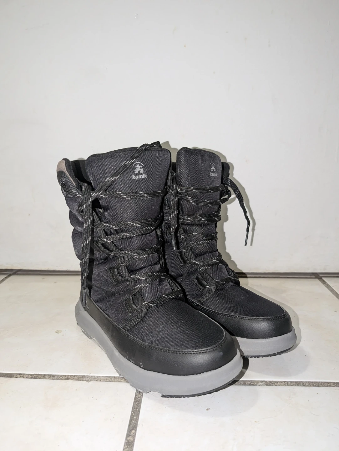 Kamik women's winter boots in black. These boots feature a lace-up front and a side zipper. The durable rubber sole provides good traction. They're great for keeping your feet warm and dry during the colder months!