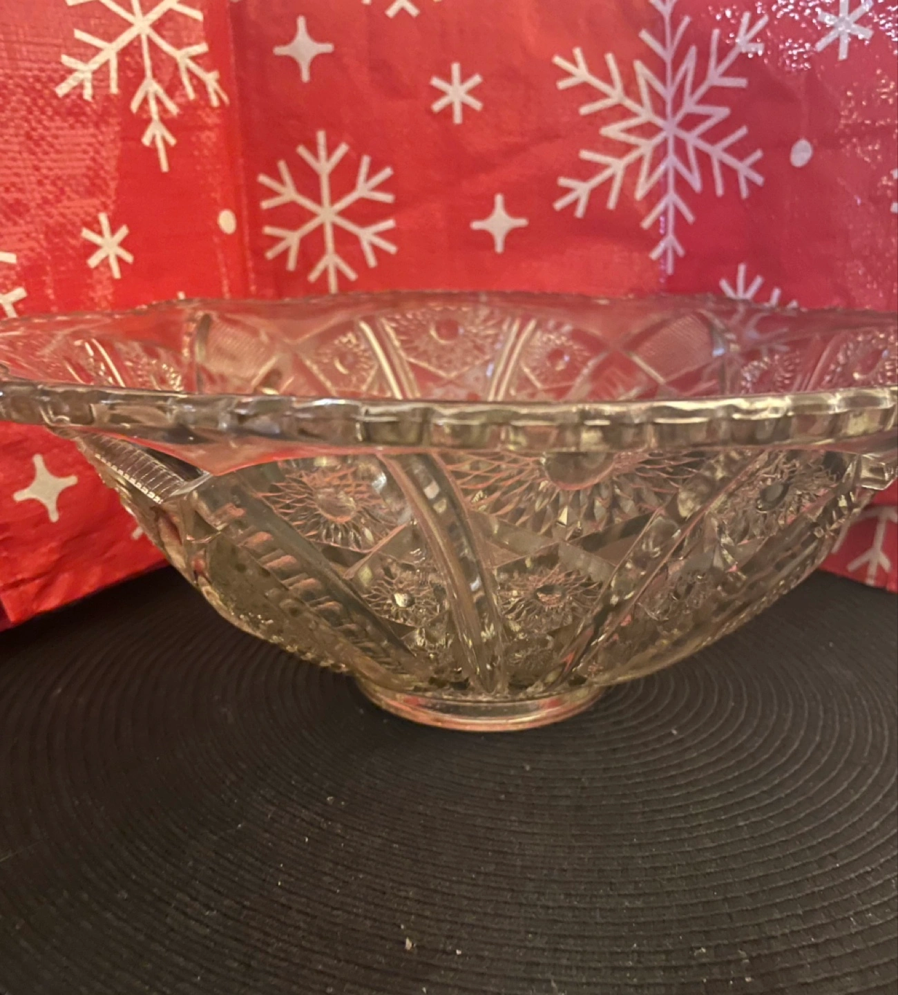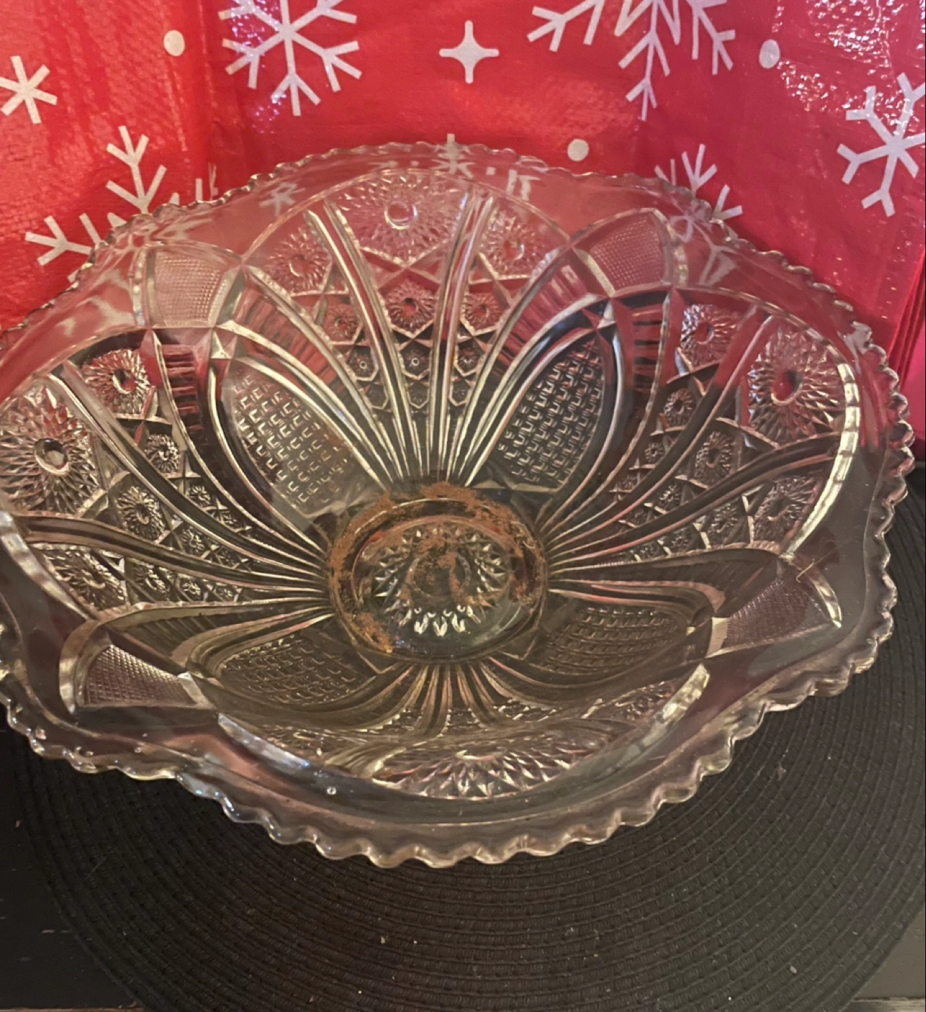 Beautiful, ornate glass bowl. Intricate pressed glass design. Scalloped edges. Perfect for serving or display. It is used, mostly by my grandmother for serving salads. I have only had it displayed as a center piece on my table. Not very much fitting of my decor and I hate it isnβt being loved like she did.