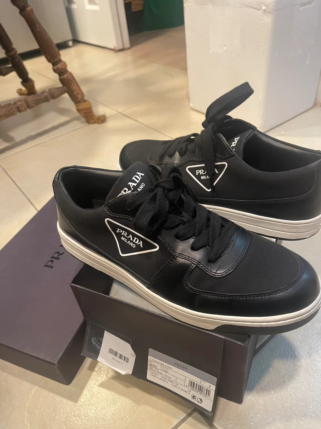 Prada sneakers made with black nylon and leather accents. They're lace-up style with white soles. These shoes are a stylish choice for everyday wear!
