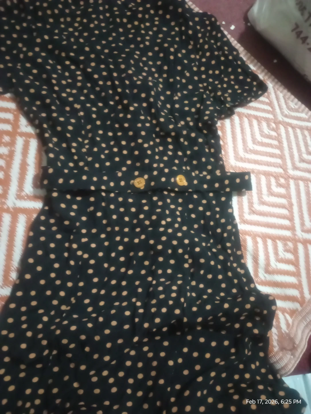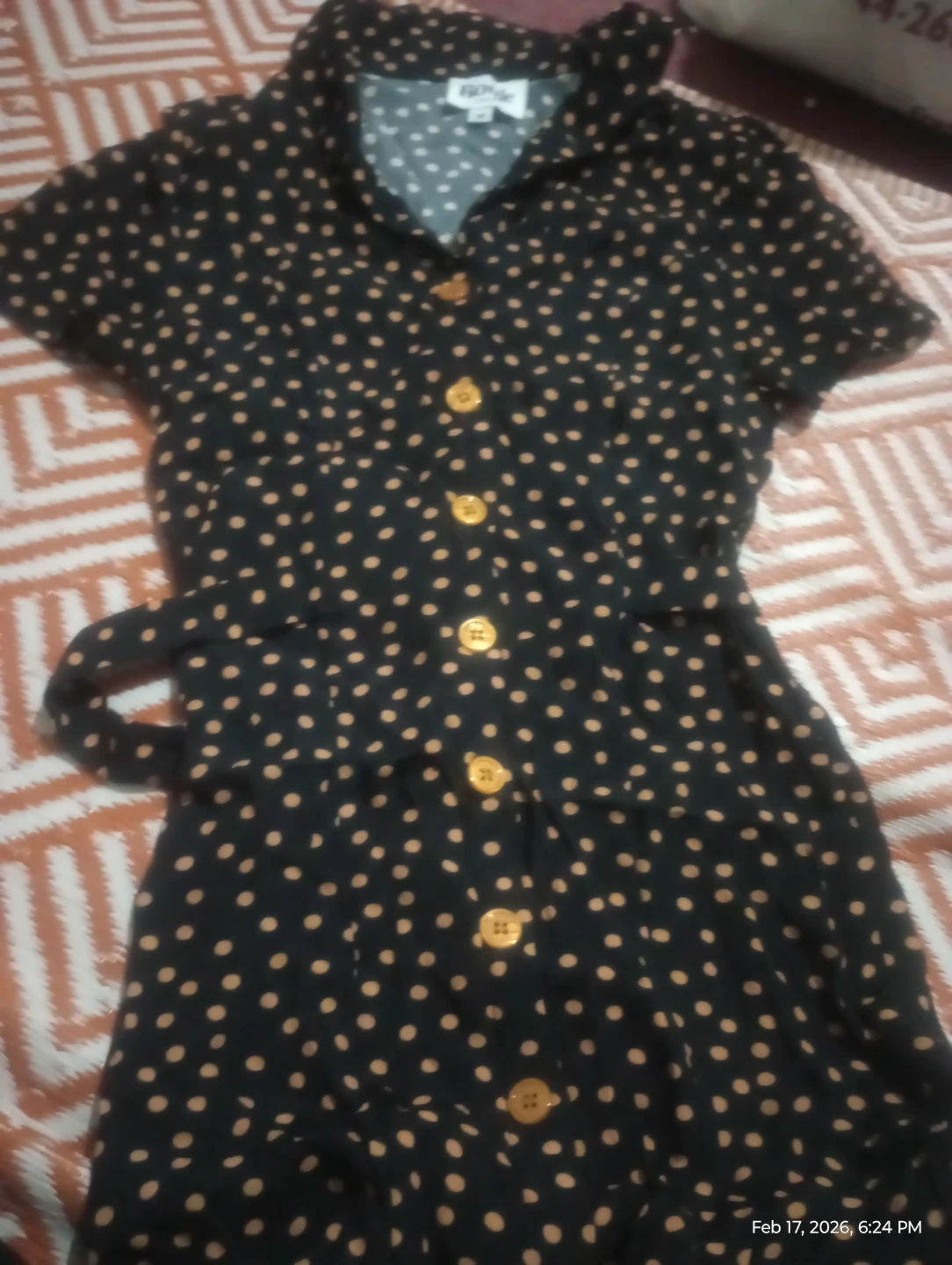 Rouje Paris dress in black with a tan polka dot pattern. It features a button-up front and a matching belt. Size 36. Short sleeves.