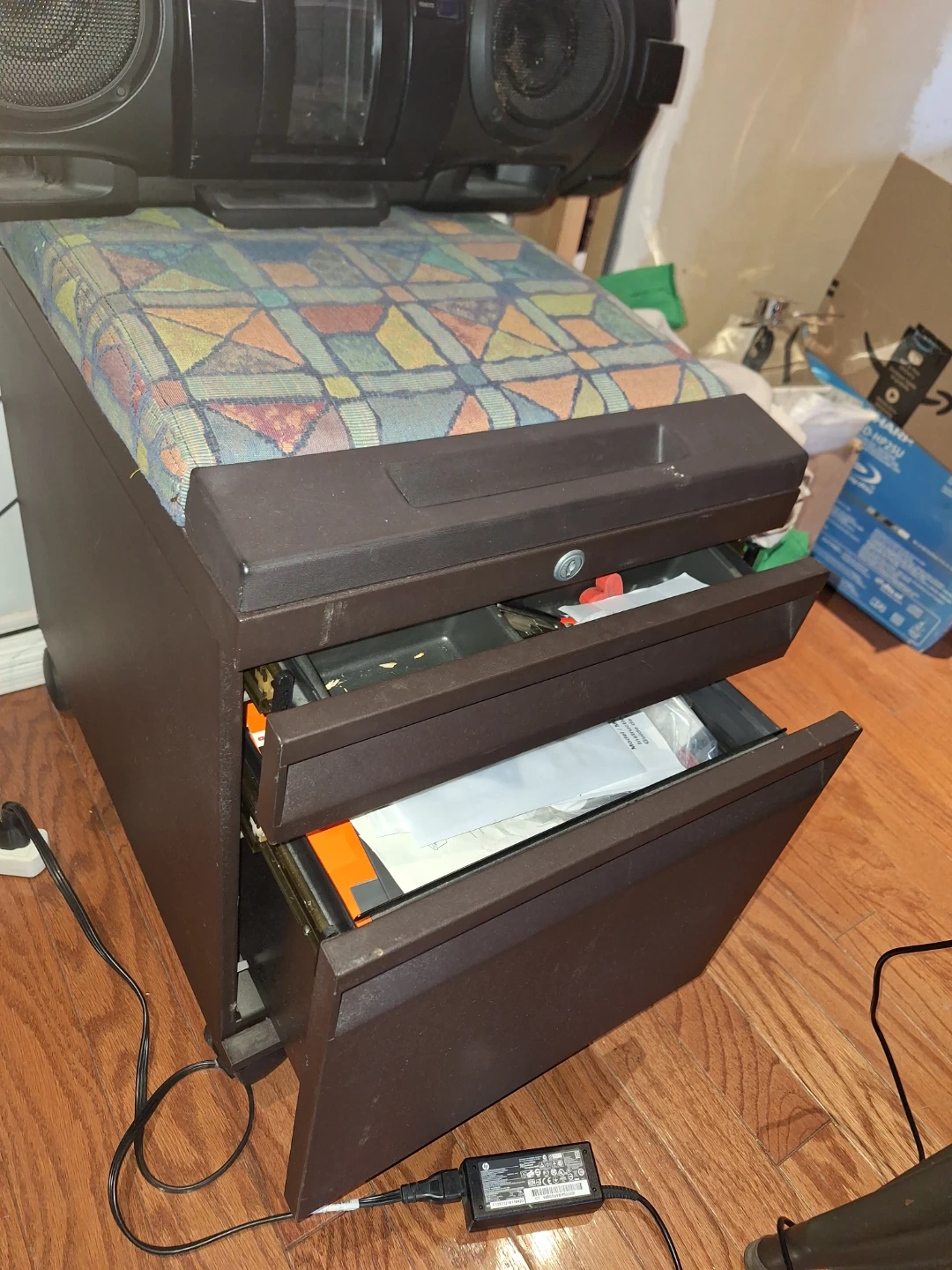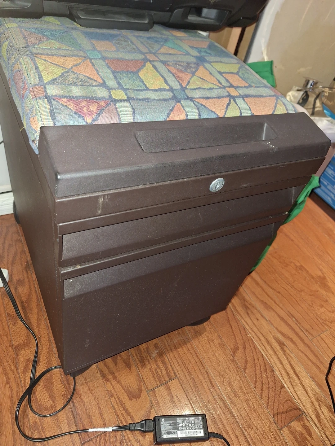 Brown 3-drawer mobile filing cabinet. It has a locking mechanism on the top drawer and wheels for easy mobility. This cabinet is great for organizing office or home documents.