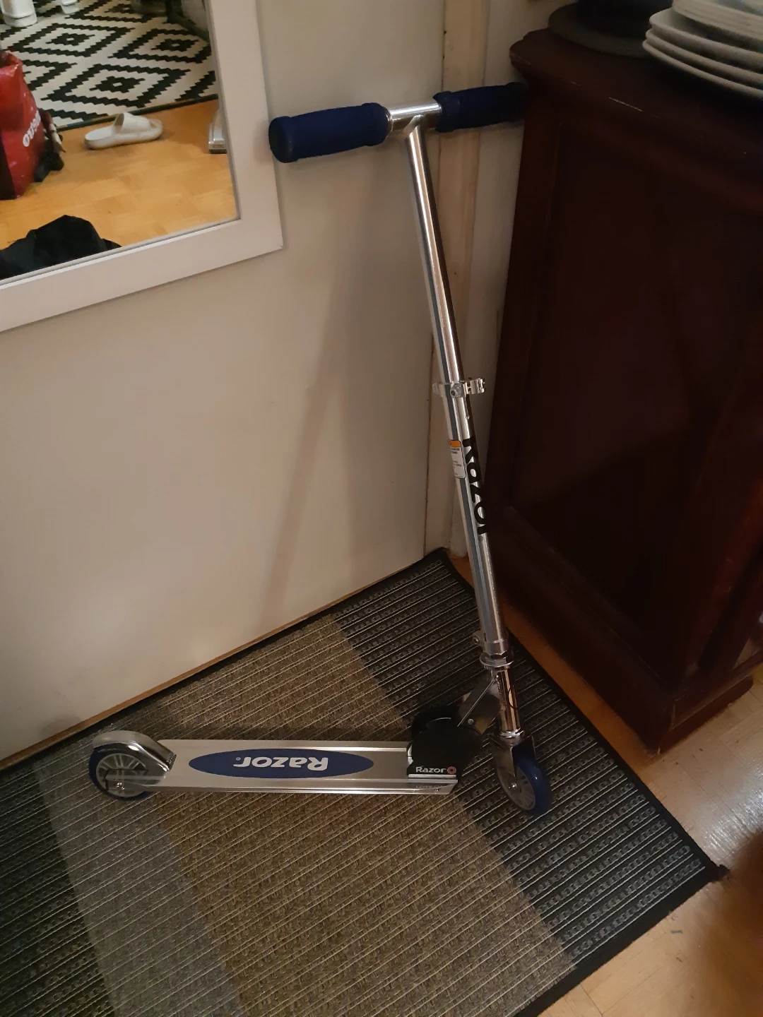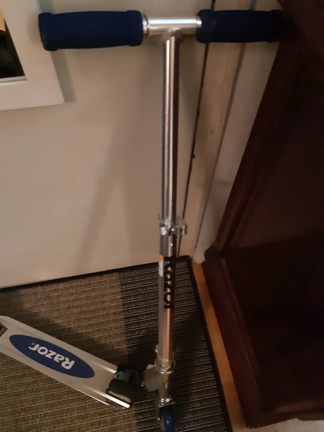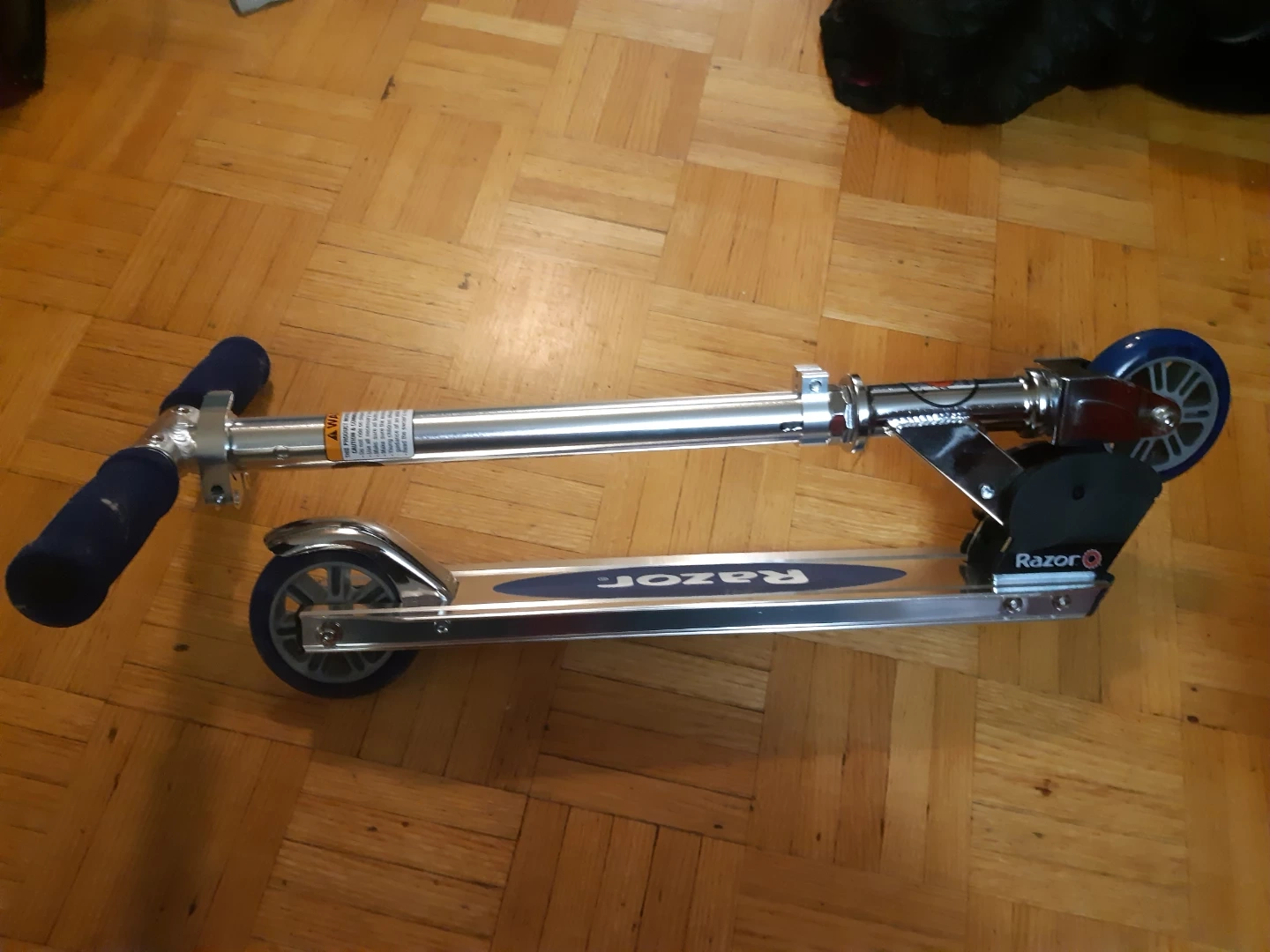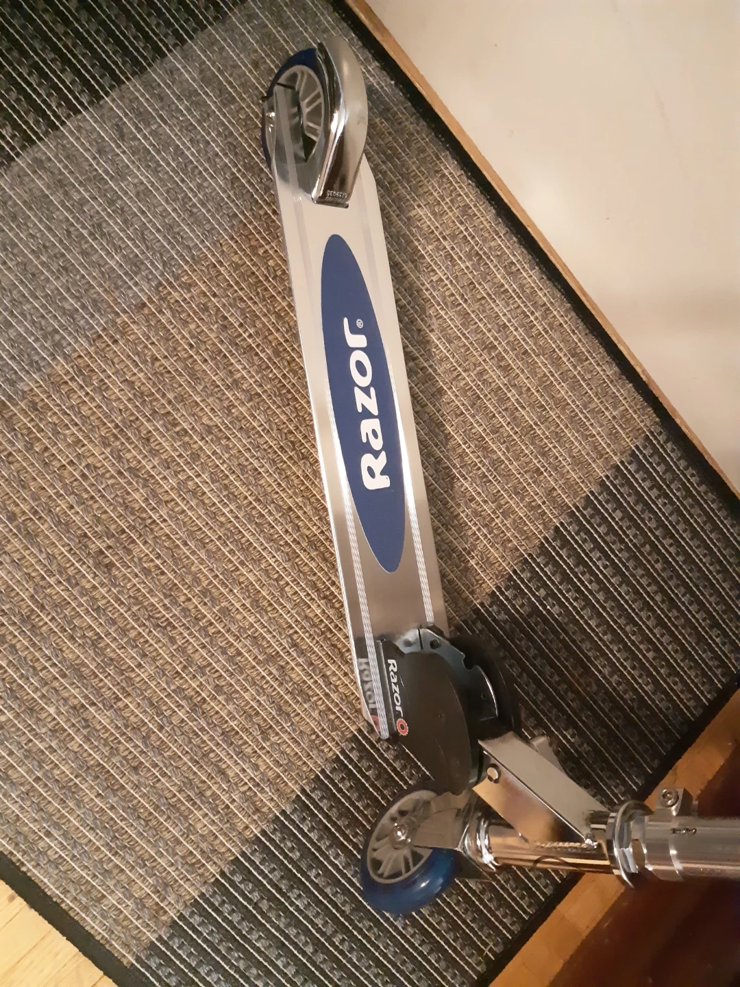A Razor scooter in silver and blue. It's made of metal with rubber grips. Easy to fold for storage. Great for getting around! Never used. Brand new.