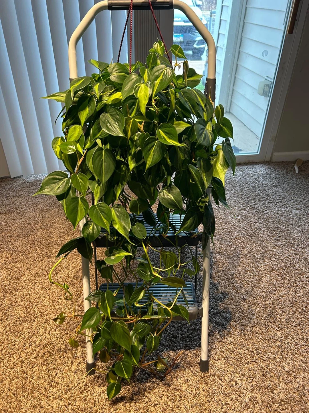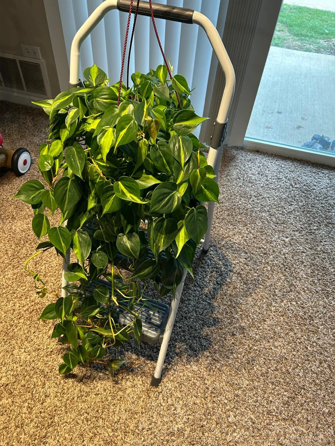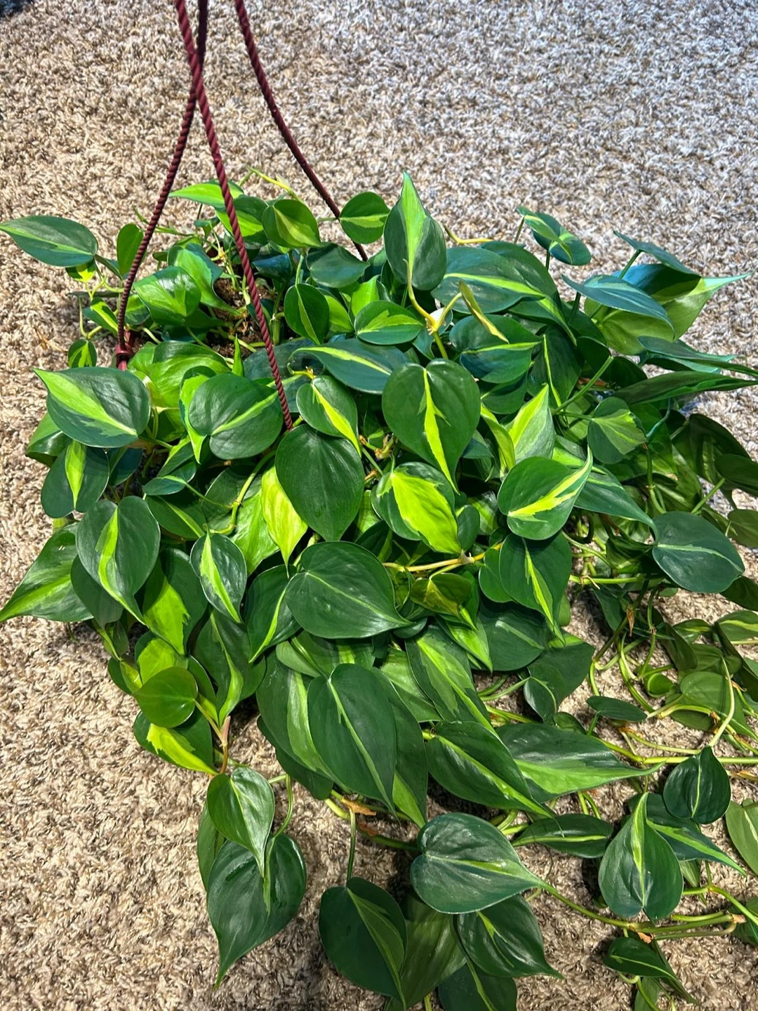 A lush and vibrant hanging Brazil Pothos plant. Its trailing vines and heart-shaped leaves add a touch of green to any space. This plant thrives in various light conditions. Easy care for beginners!