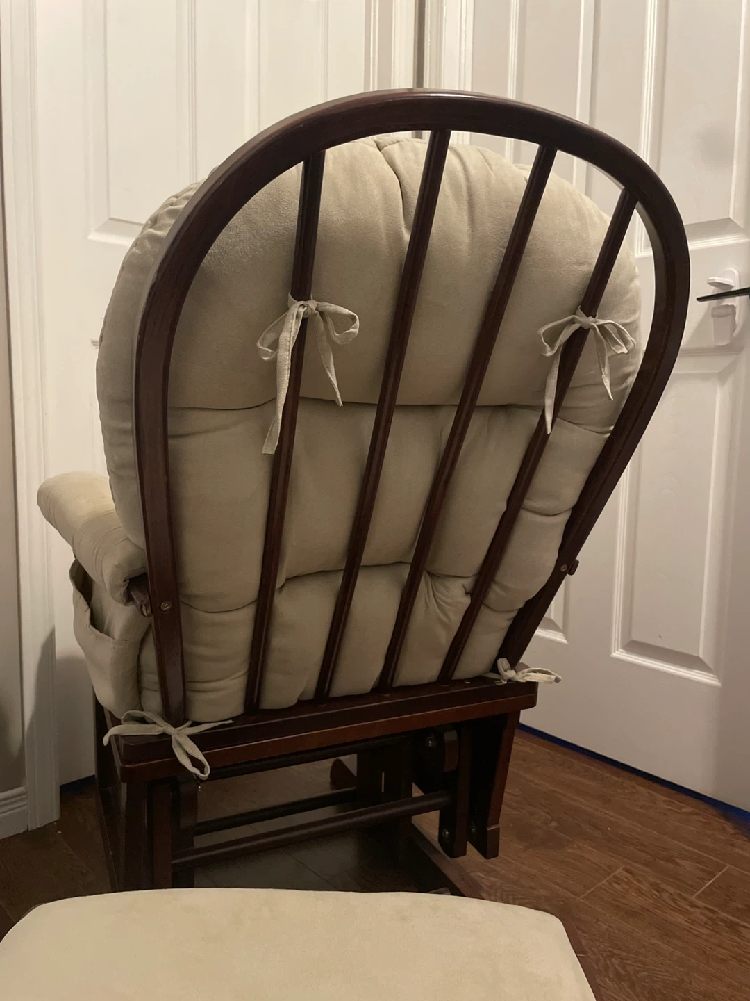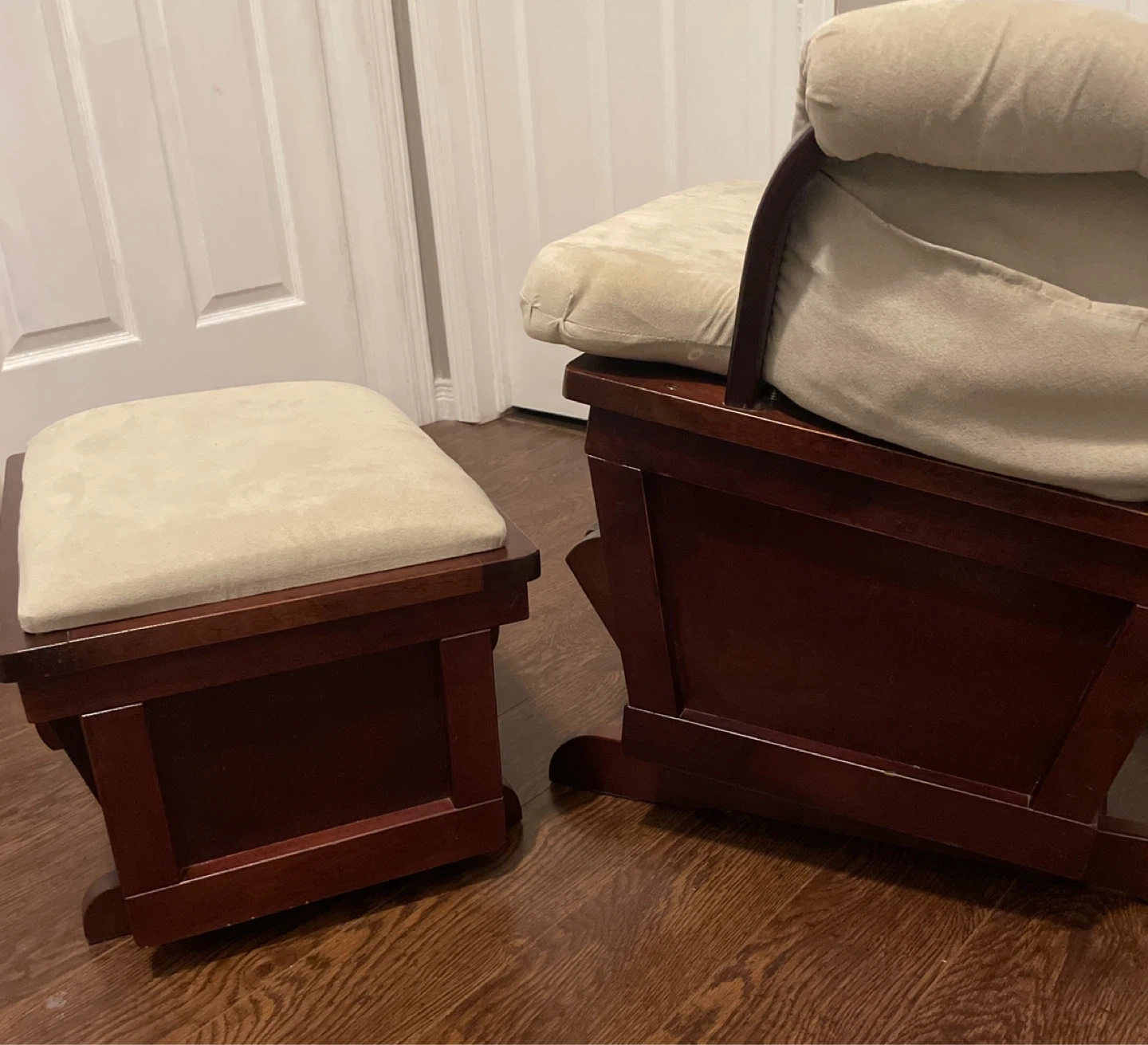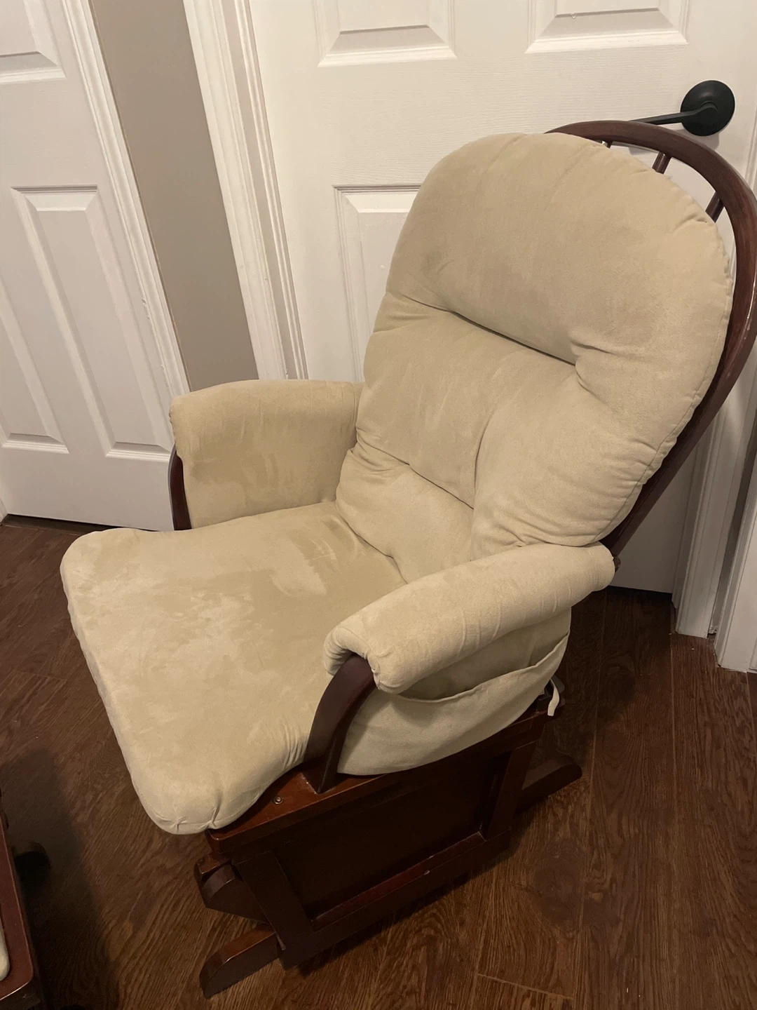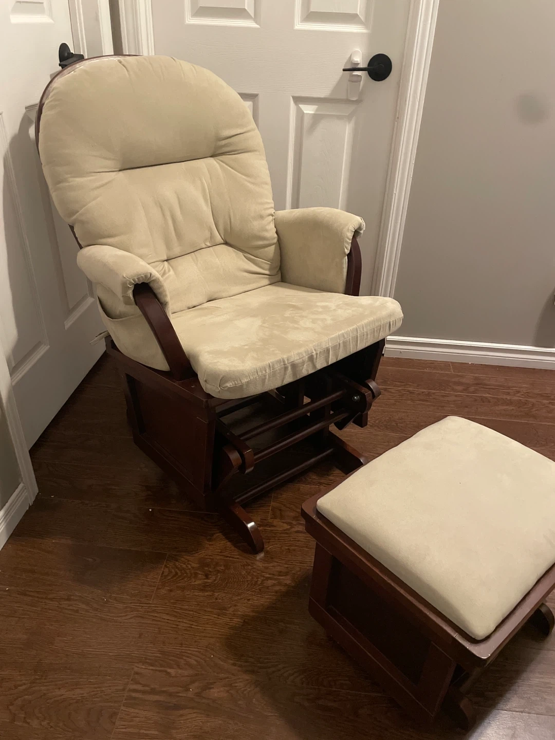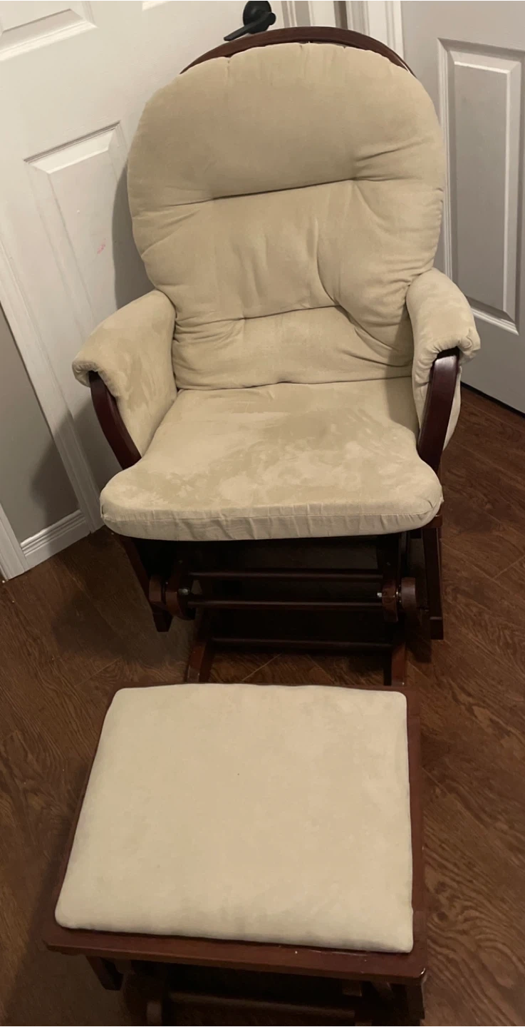 Comfortable glider rocking chair and matching ottoman set. Features tan suede cushioning and wooden frame with a dark finish. Large pocket on either armrest.