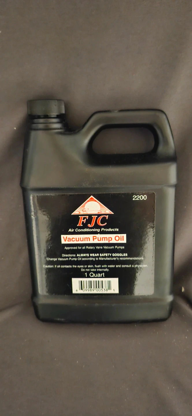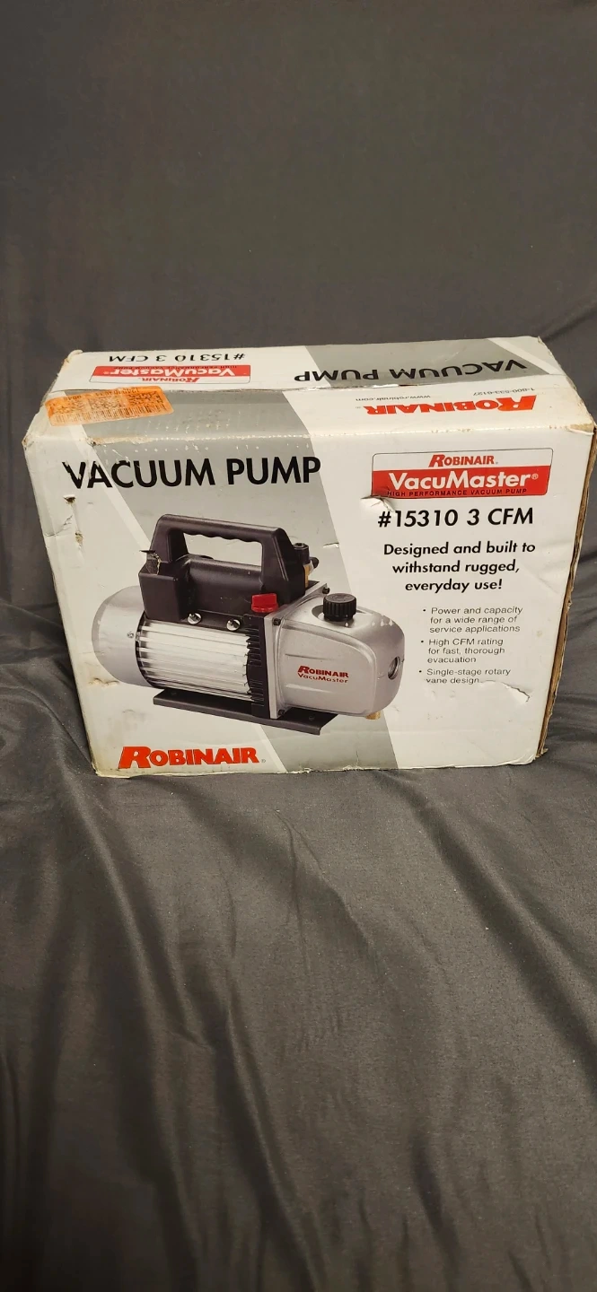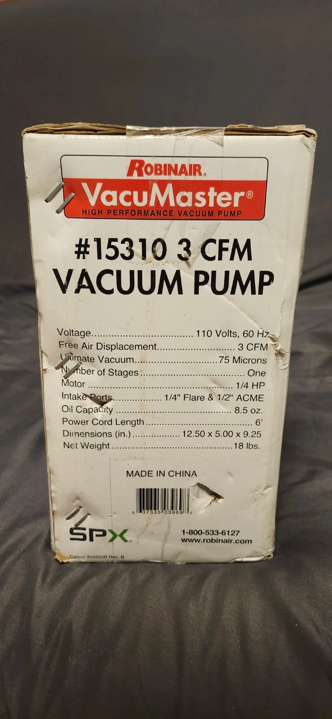 Robinair VacuMaster #15310 3 CFM vacuum pump. It runs on 110 Volts, 60 Hz and has a 1/4 HP motor. Includes 1 quart of FJC vacuum pump oil.