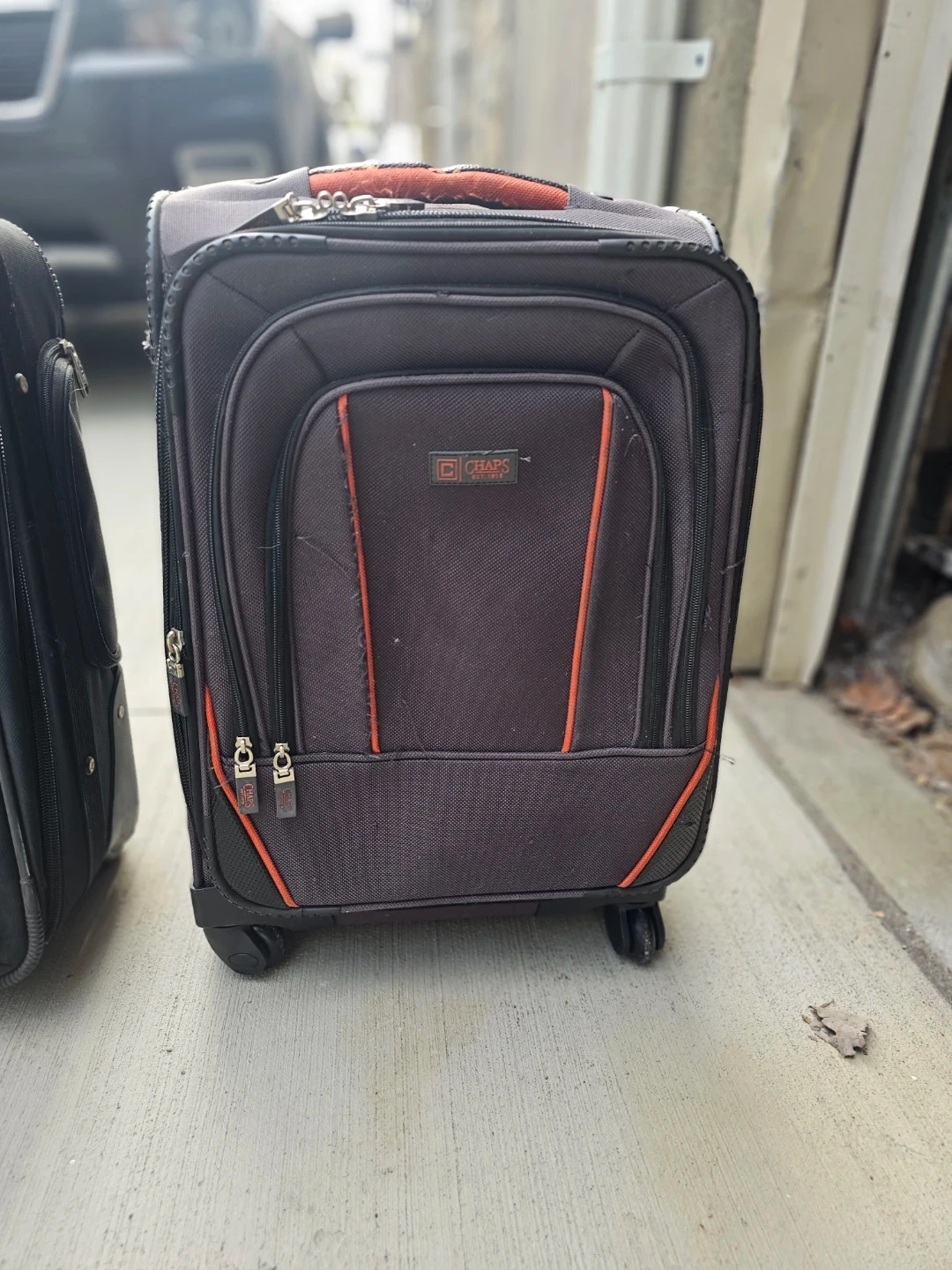 This is a Chaps carry-on suitcase. It's dark gray with orange trim. Features a top handle and wheels for easy transport. This suitcase is great for short trips!