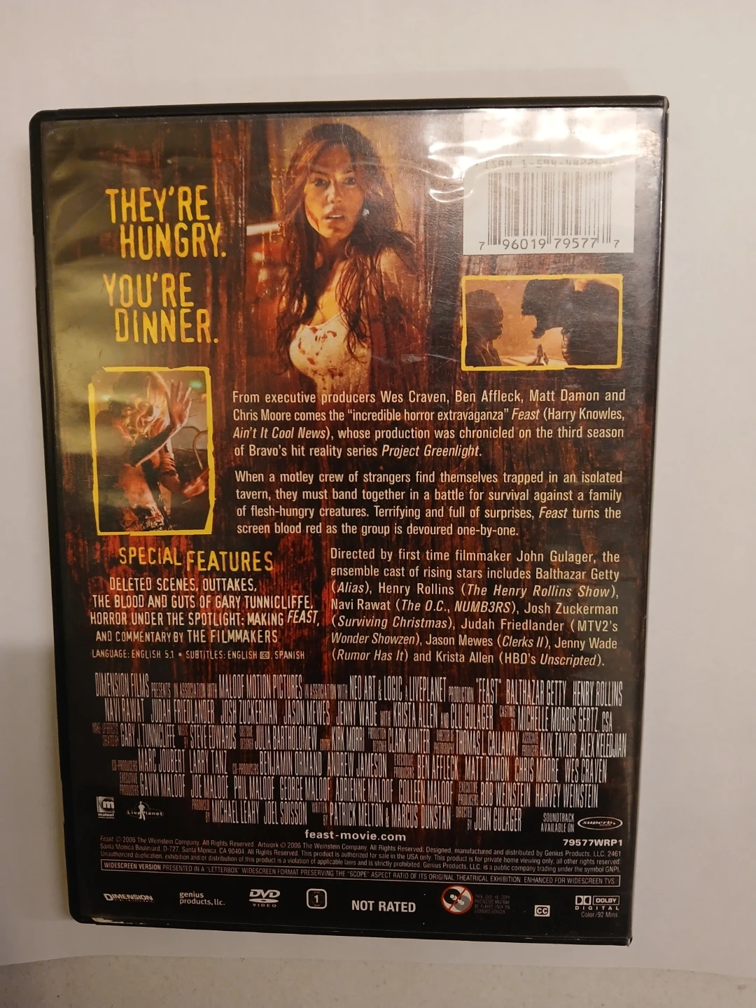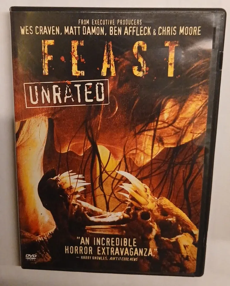 This DVD is for the horror film Feast. It features an unrated cut of the movie. Includes special features like deleted scenes and commentary.