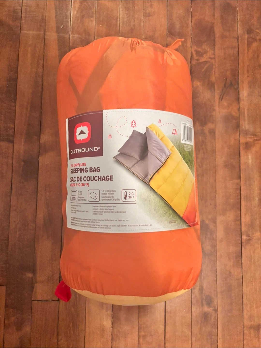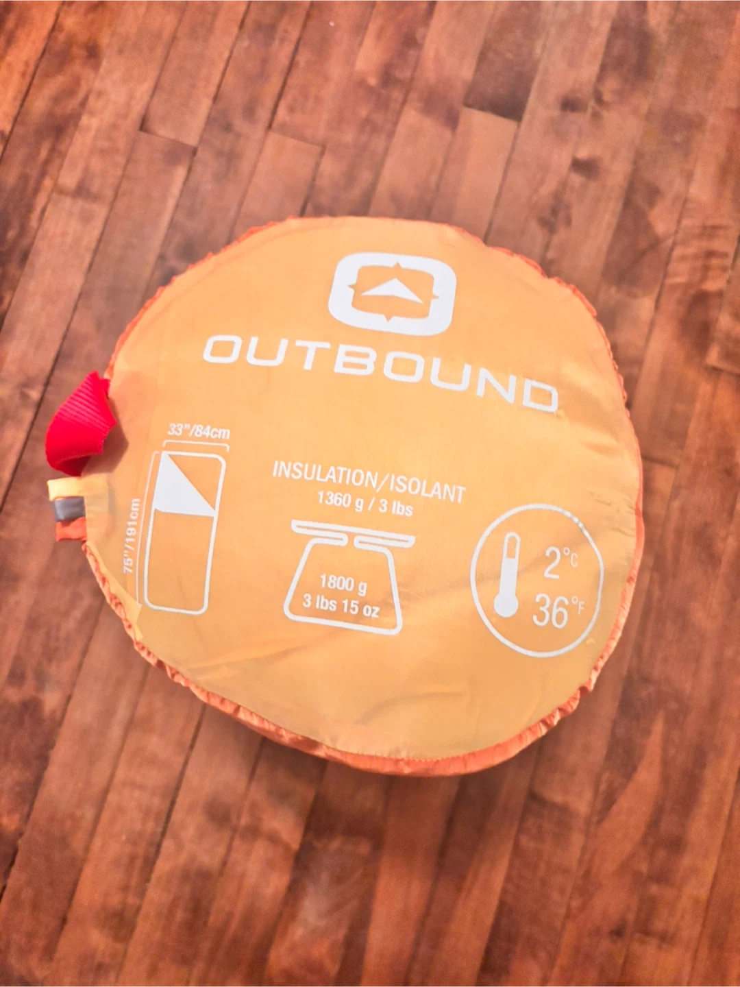 This is an Outbound 2°C (36°F) Lite sleeping bag. It has 1360 g / 3 lbs of insulation. The dimensions are 75"/191 cm long and 33"/84 cm wide. It's rated for 2°C (36°F) temperatures.