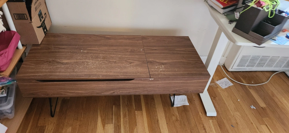 Free lift top coffee table, it is a bit beat up (scratched and chipped corner) but good fixer upper. Had to re-drill the legs myself as well. Pick-up only from second floor walkup, ideally tonight 5/31 or Monday 6/2.